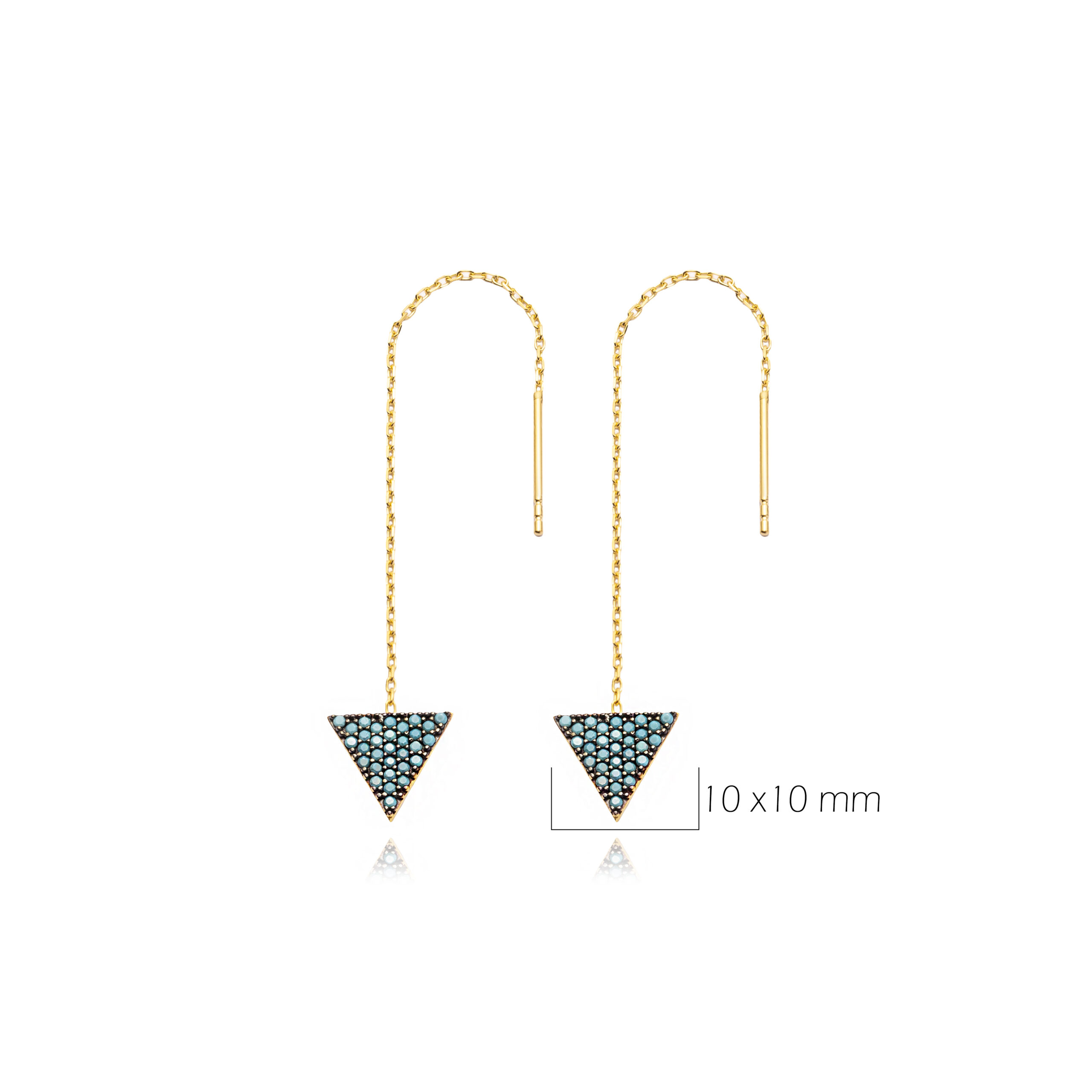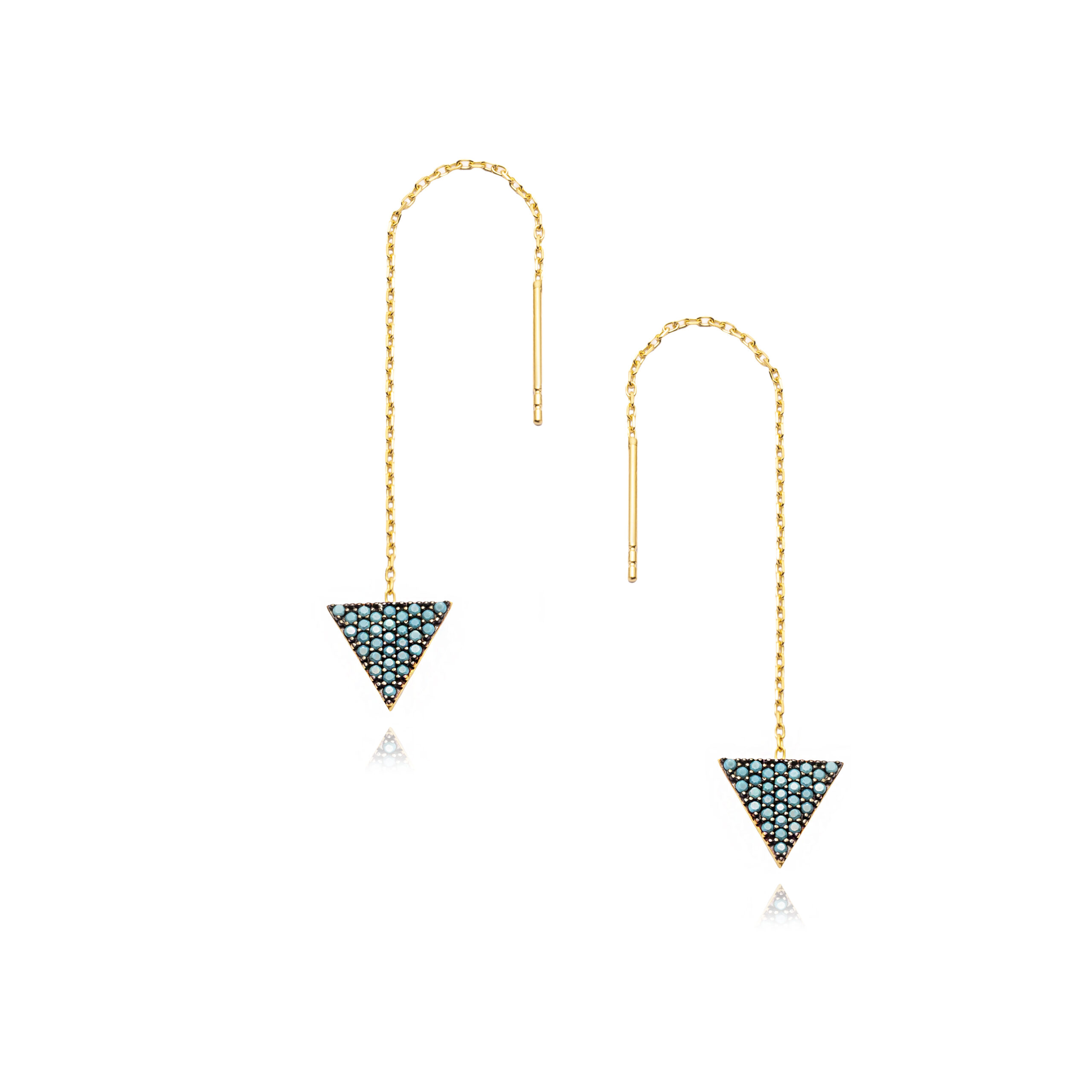 Les boucles d’oreilles Ilayda Fileuse en argent 925 plaqué or 16 carats suspendent un triangle entièrement pavé de cristaux de turquoise, au bout d’une chaînette fluide.