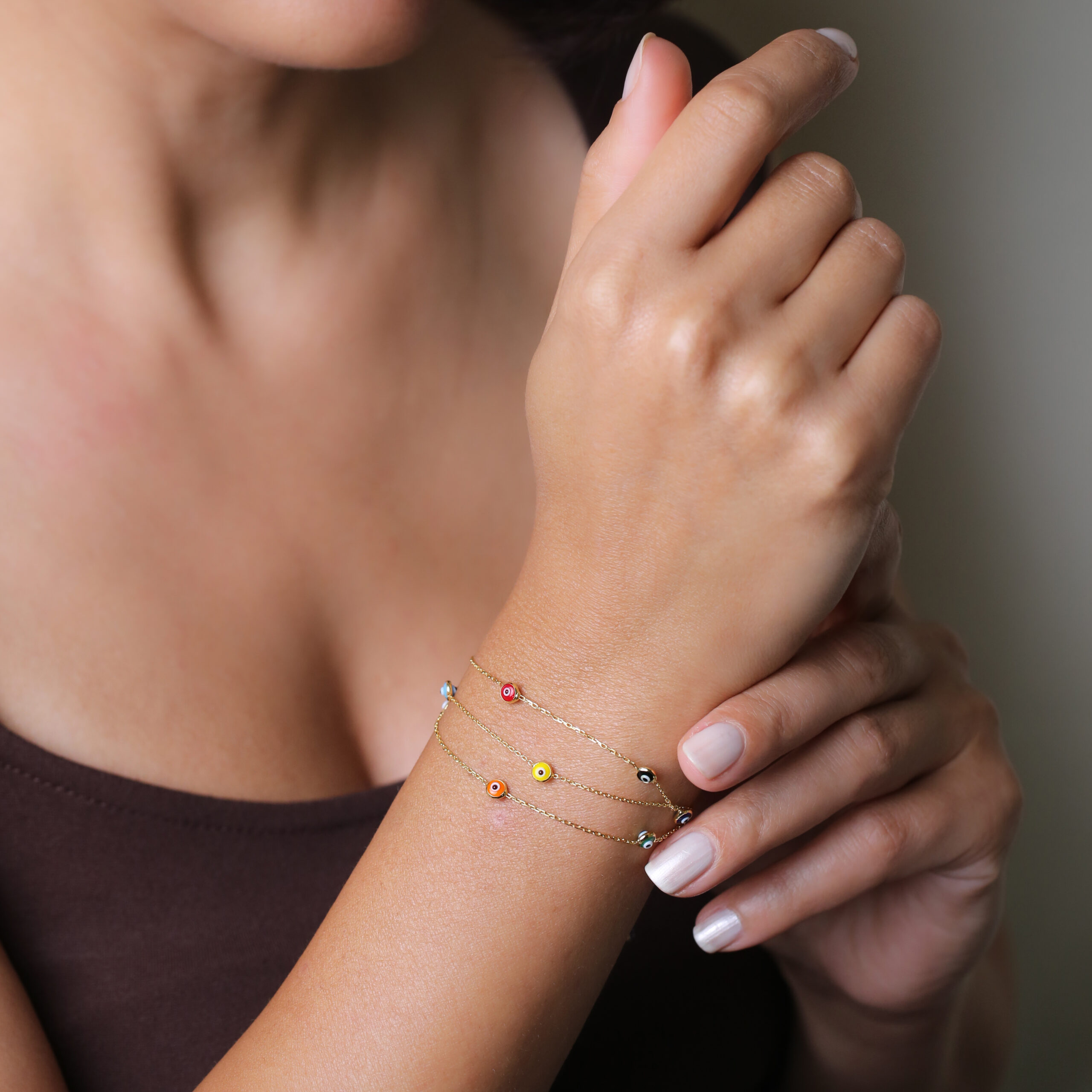 Le Bracelet Multi-Göz, en argent 925 doré or 16K, déploie une série de Nazars protecteurs pour une défense énergétique renforcée.