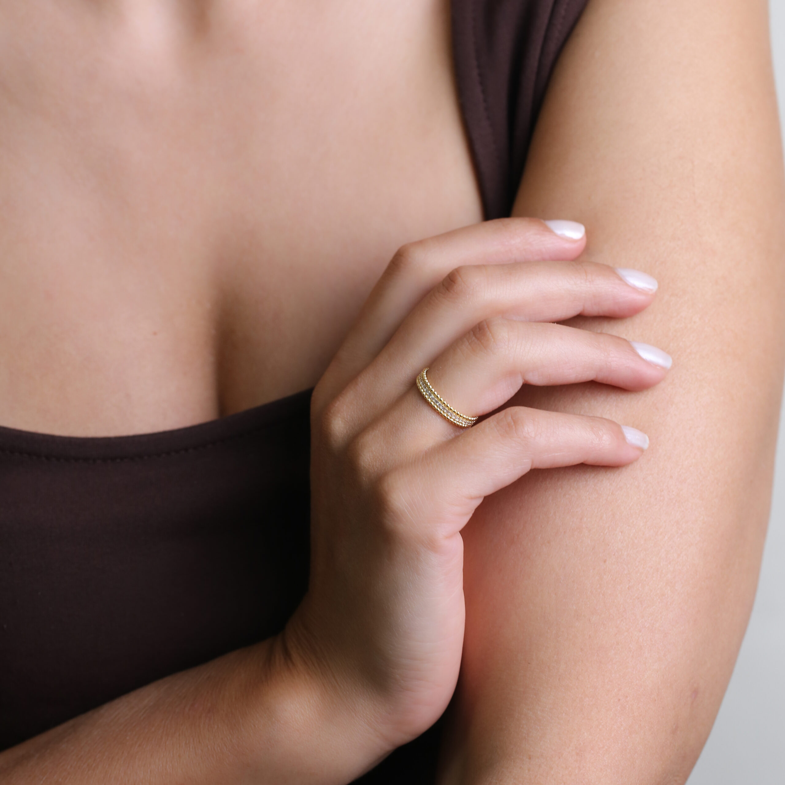 Narine Circle est une bague pensée pour celles qui recherchent une élégance intemporelle. Forgée à la main en argent 925 massif puis habillée d’une dorure or 16k de 1,5 micron, elle offre une chaleur visuelle proche de l’or véritable. Sa structure est composée de deux rangées délicatement rythmées de petites sphères lisses, une architecture douce qui épouse le doigt avec naturel. L’oxyde de zirconium blanc central apporte une touche de lumière, capturant les reflets pour souligner la finesse du design.