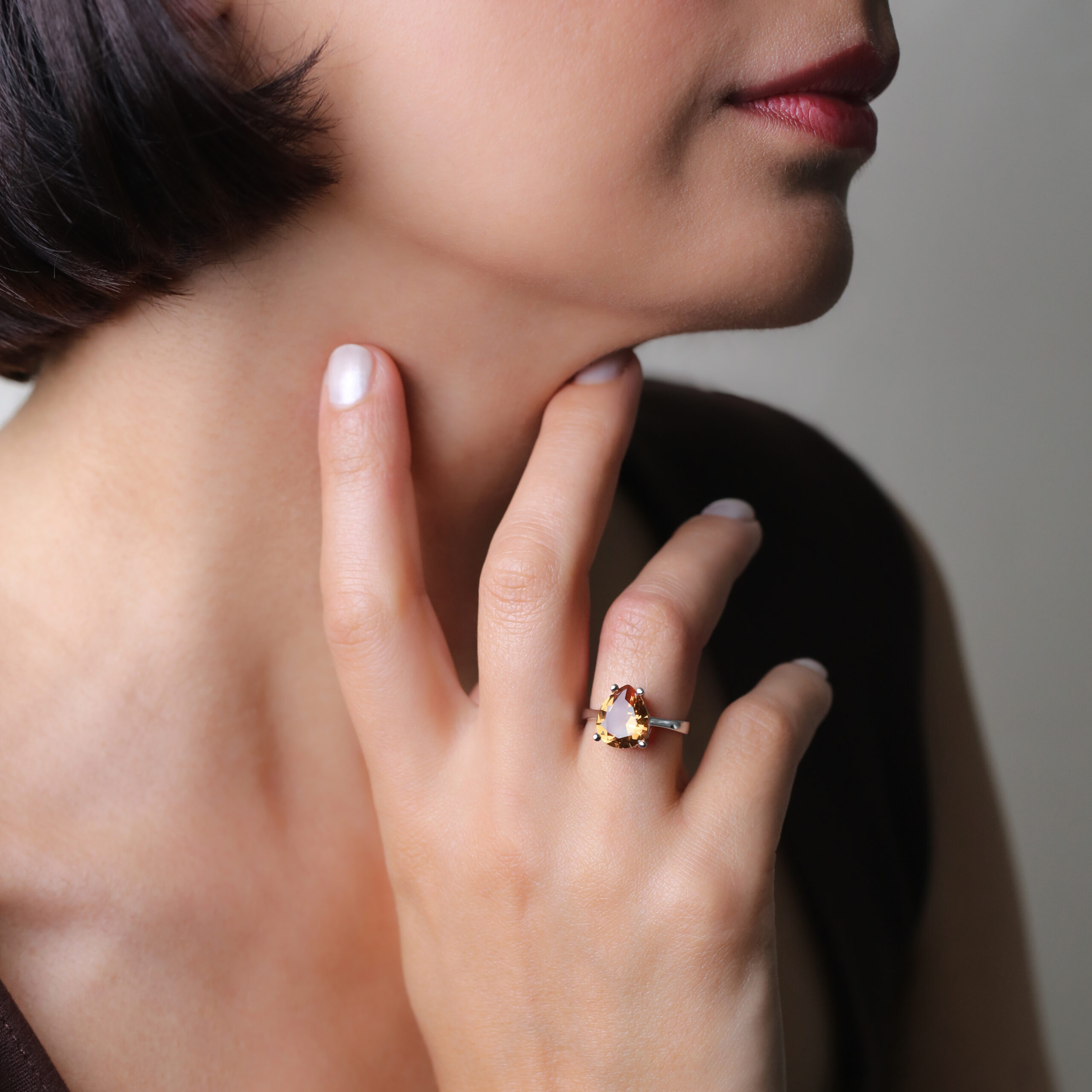 La forme en goutte évoque une lumière qui descend vers la main et le cœur. La Zultanite à base d’oxyde de zirconium de grade AAA symbolise l’adaptabilité, la liberté intérieure et l’acceptation de toutes les facettes de soi. Ses nuances champagne ou vert olive reflètent l’ambiance environnante comme un miroir émotionnel subtil. Porter cette bague, c’est choisir un talisman de transformation douce qui rappelle que l’on peut changer, évoluer et rester alignée avec soi même. Elle agit comme un rappel silencieux de confiance, de mouvement et de souplesse face aux changements.