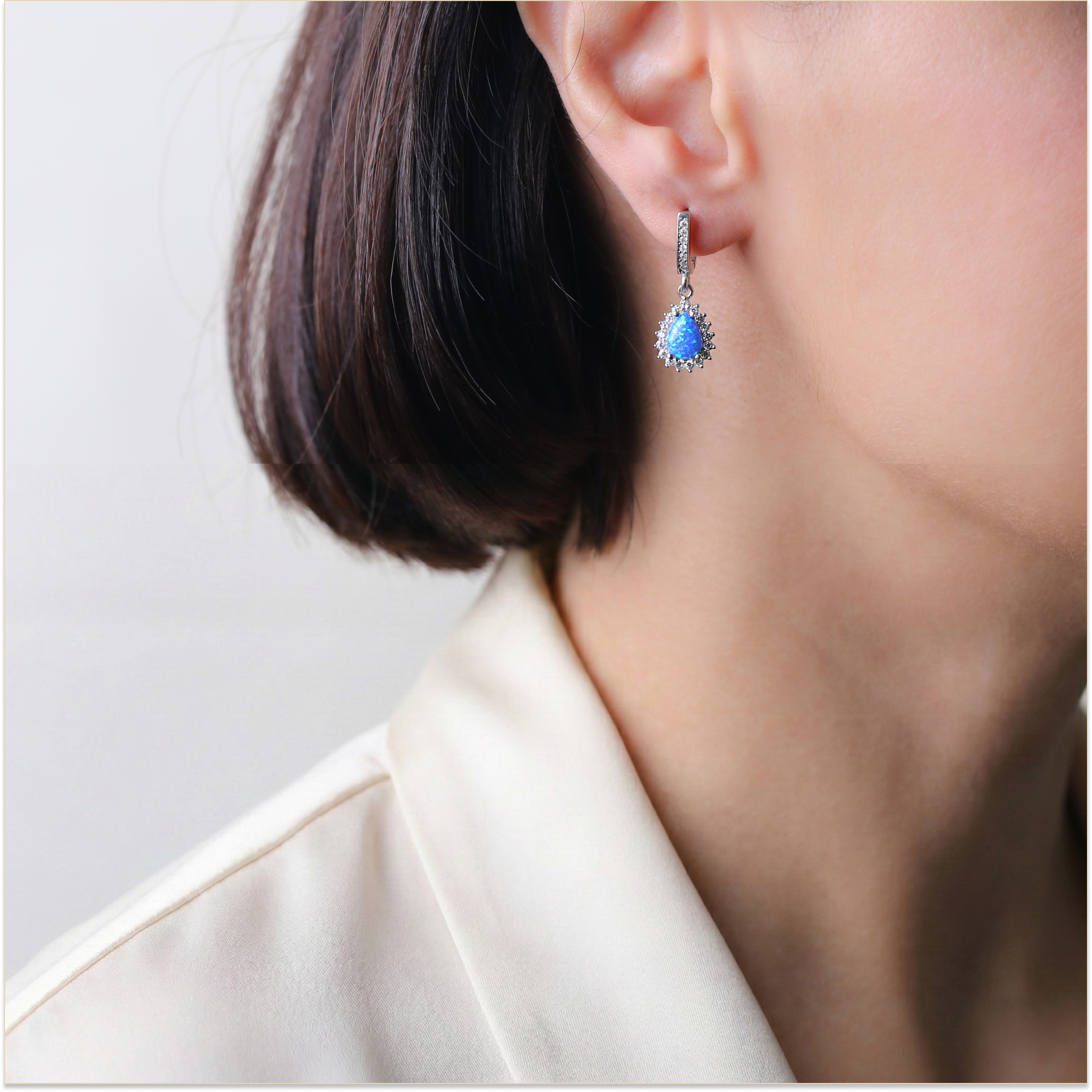 Inspirées de Deniz Tanrıçası, l’esprit marin protecteur des légendes anatoliennes, ces boucles évoquent les rivages turquoises de la mer Égée. Sous l’Empire ottoman, les bijoux aux teintes bleutées représentaient la pureté du cœur et la protection spirituelle. Les orfèvres d’Istanbul perpétuent ce savoir-faire sertie d’une opale bleu véritable centrale, dans une monture d’argent rhodié au fini miroir, résistante et lumineuse.