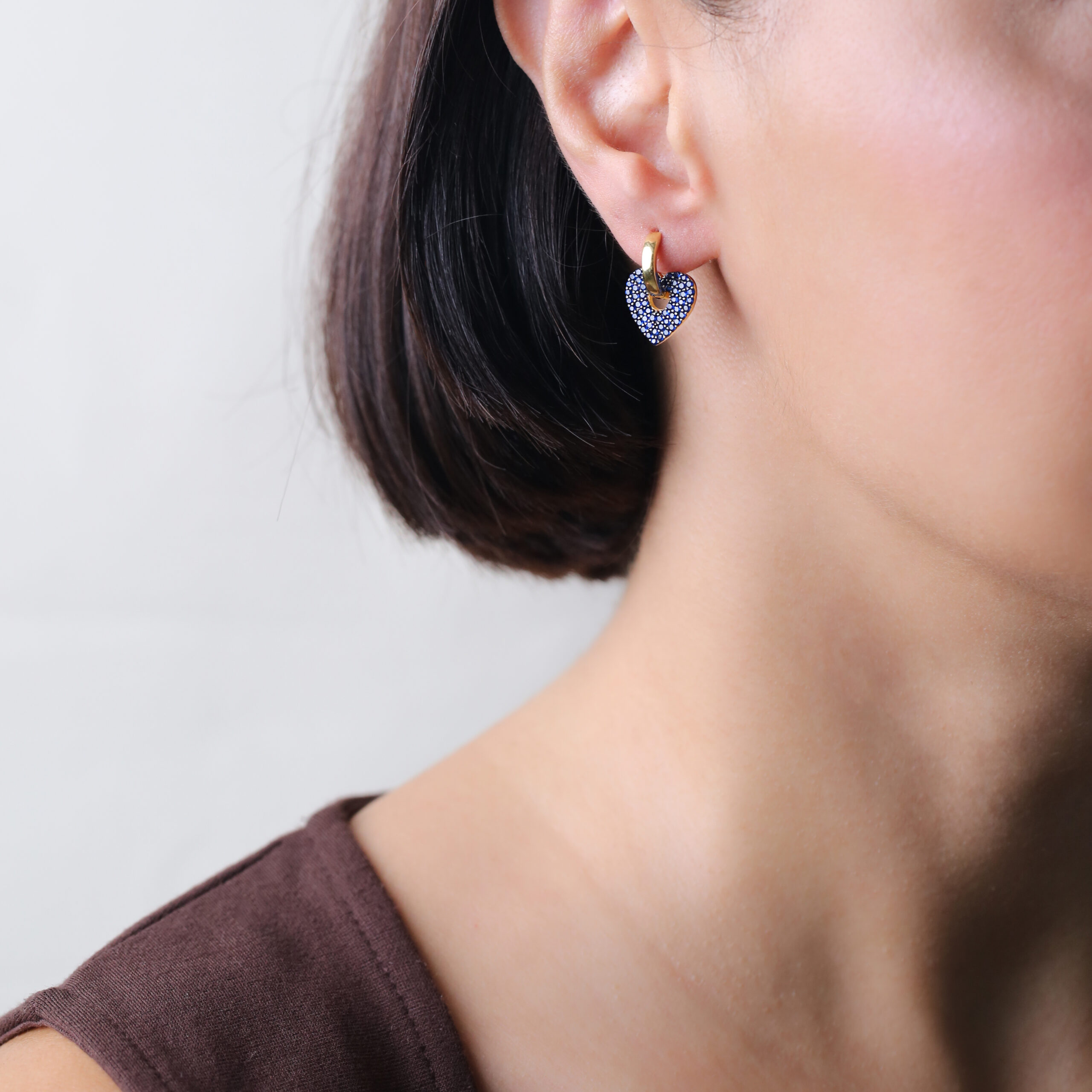 Boucles en argent 925 doré or 16k, ornées d’un cœur pavé d’oxydes de zirconium saphir, symbole d’amour protégé et de charme irrésistible.