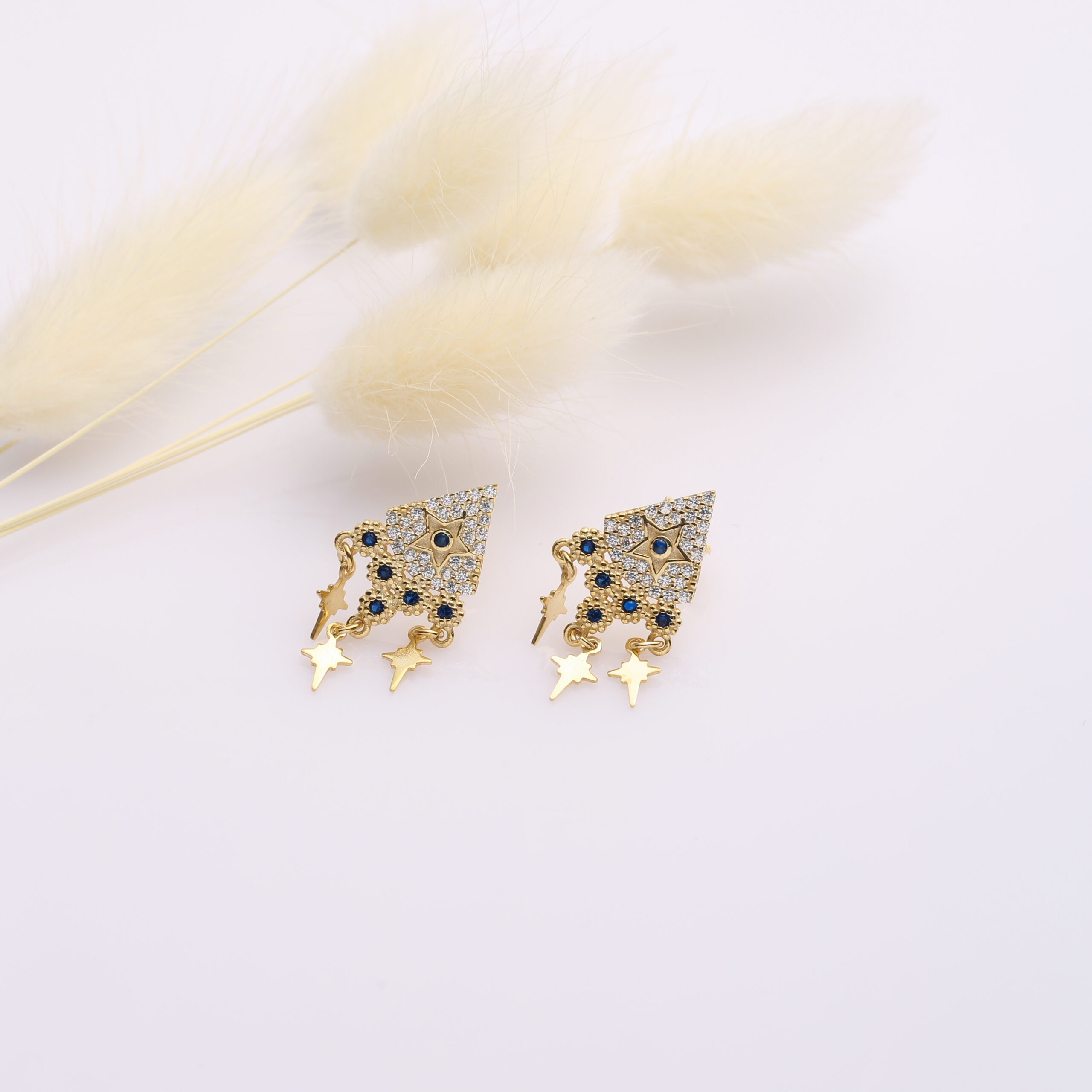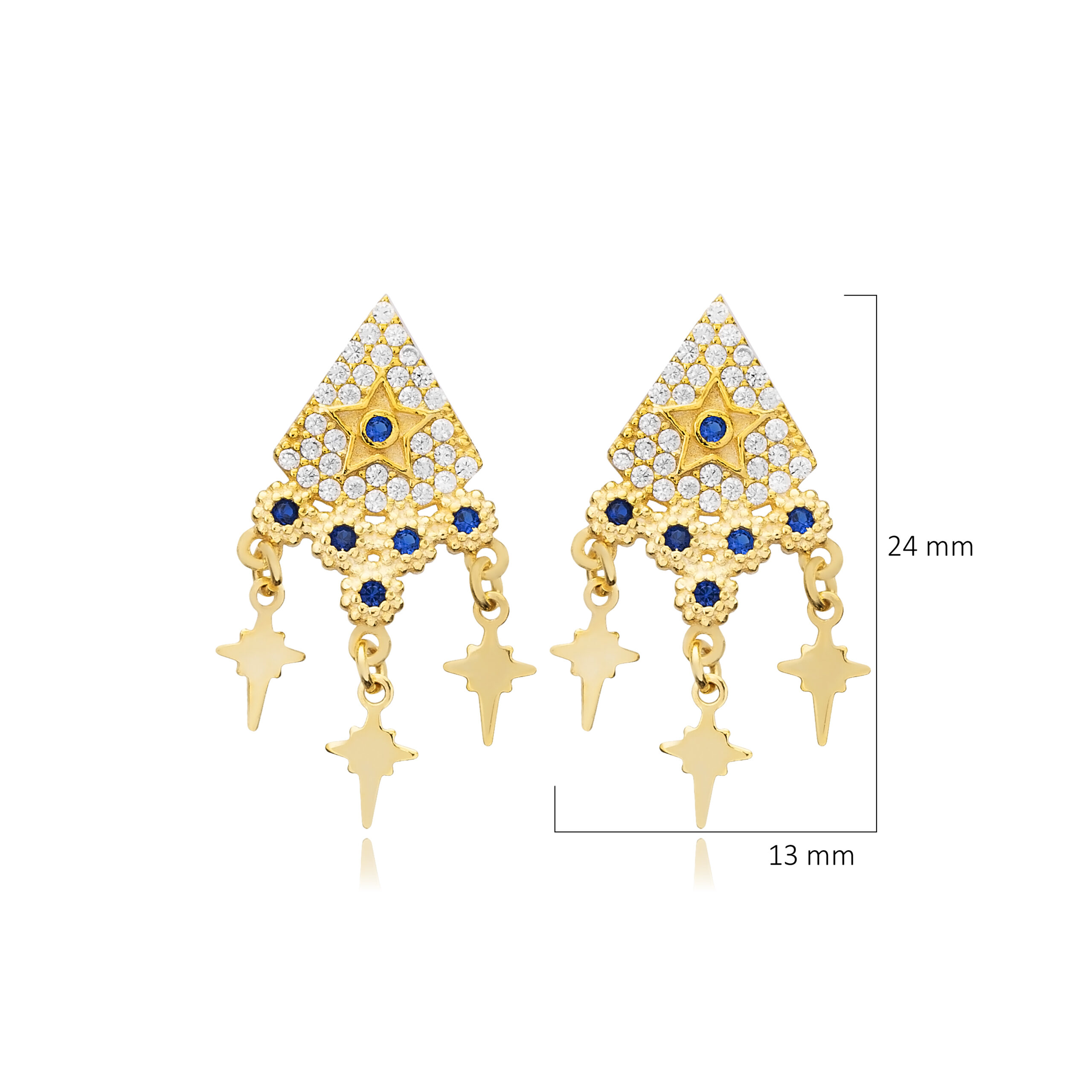 Ces boucles, baptisées Ayliz-Kutup Yıldızı, manipulent les motifs stellaires avec une finesse rare. Inspirées de la mythologie grecque et du symbole universel de l’Étoile du Nord, elles incarnent une boussole lumineuse pour la femme qui avance avec confiance. La structure supérieure adopte un losange pavé de zircons blancs éclatants, captant la lumière à la manière d'une étoile figée dans le ciel. En son centre, un zircon bleu saphir profond évoque la voûte céleste à l’heure bleue, contrastant avec la chaleur de la dorure or 16k.