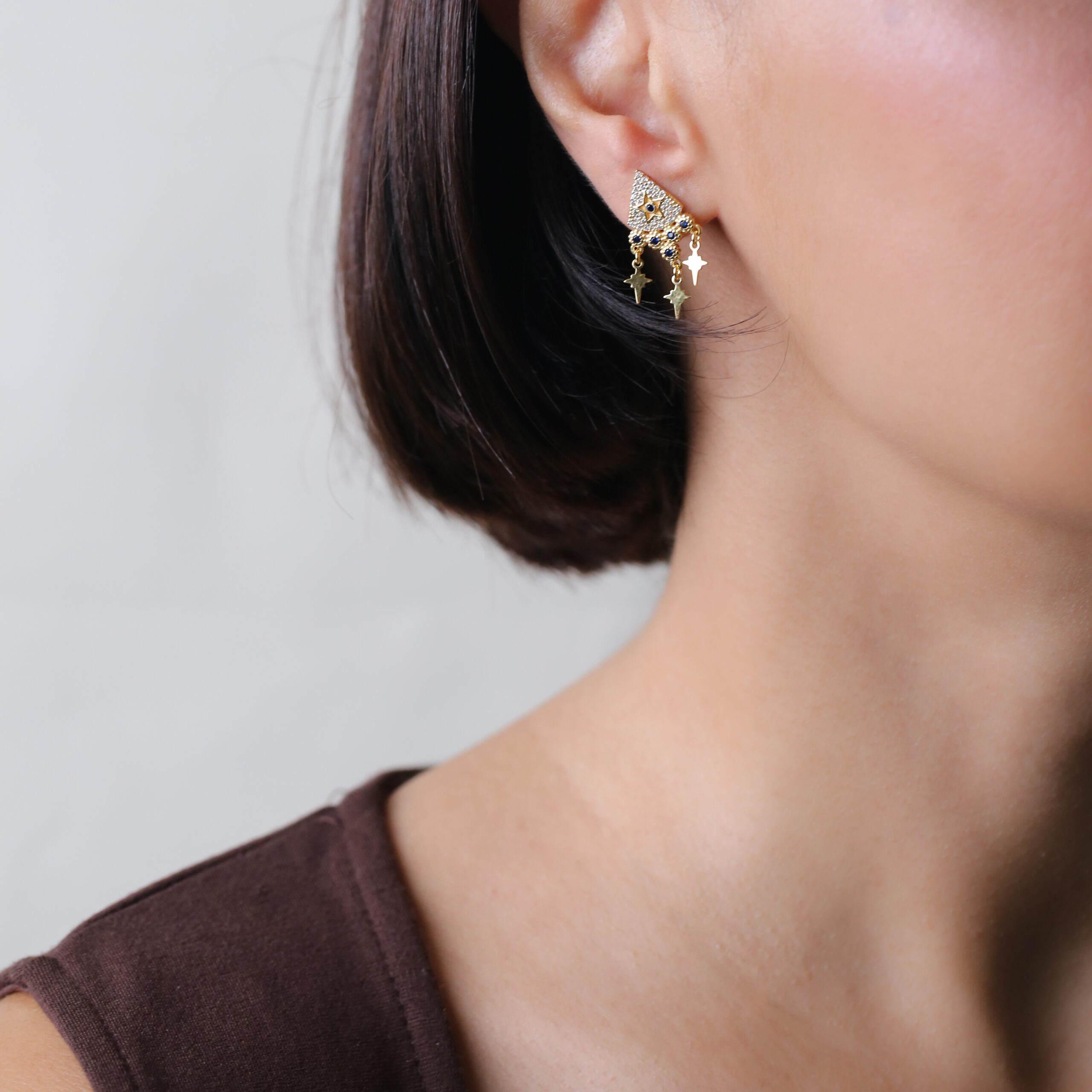 Sous cette première pièce, une dentelle d’or fin accueille elle aussi une pierre saphir, créant une continuité chromatique entre ciel nocturne et soleil levant. Puis vient le mouvement : trois étoiles stylisées, suspendues comme des pampilles délicates, dansent au rythme de votre démarche. Ce jeu de mobilité ajoute un charme boho-chic irrésistible, offrant une présence poétique à chaque inclinaison de la tête.