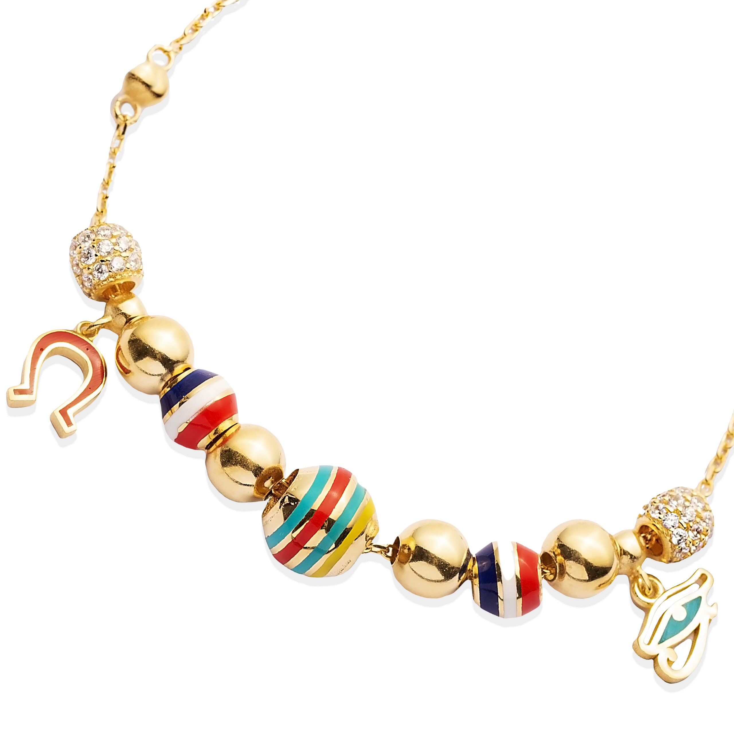 Bracelet Charm Eye of Râ en argent 925 doré or 16k, combinant Fer à Cheval rouge et Œil de Râ turquoise, décoré de perles émaillées et rondelles pavées de zirconiums. Fait main.