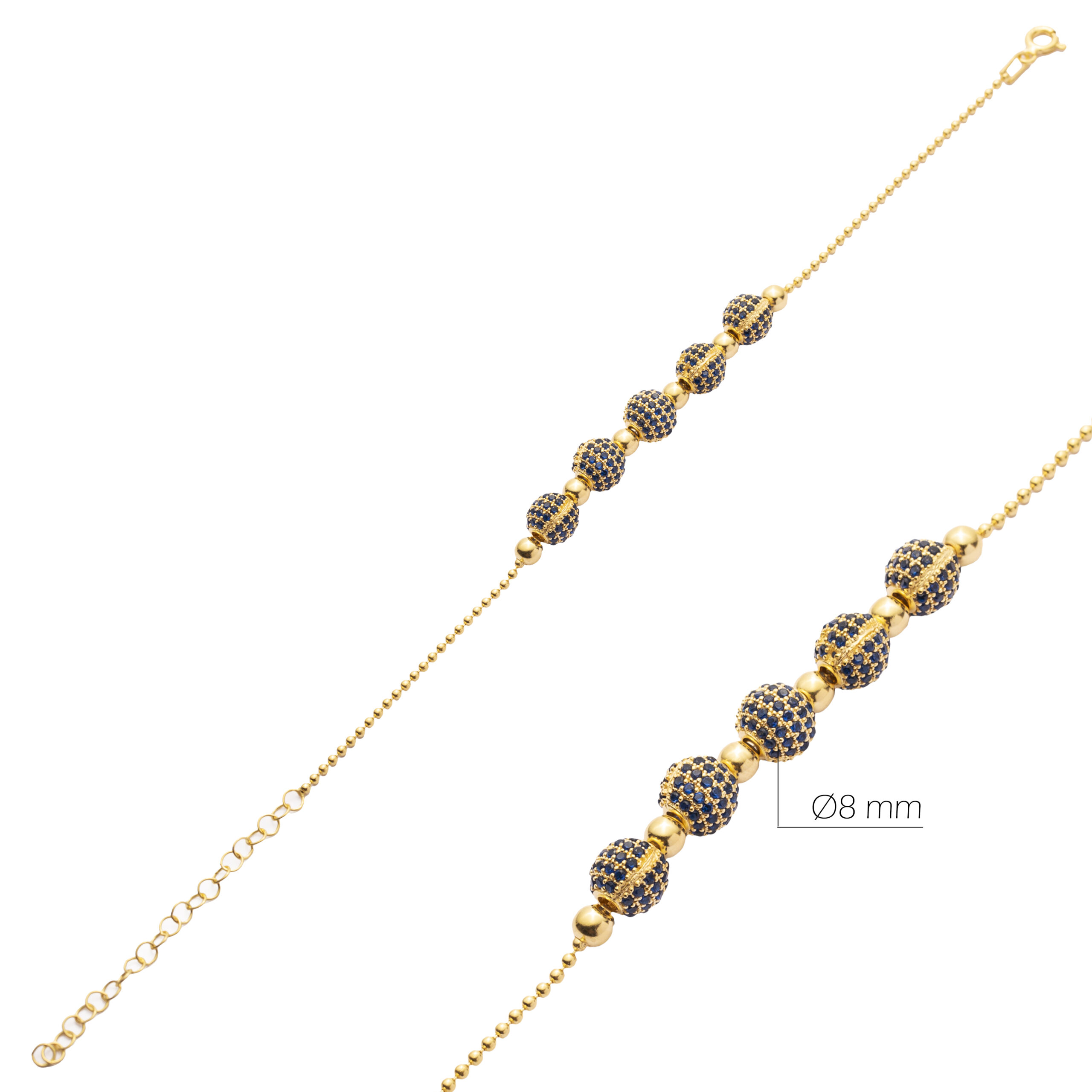 Bracelet Gök-Bille Tasbih réglable en argent 925 doré or 16 carats, composé de cinq sphères aux reflets saphir azur (en oxydes de zirconium taillés), façon perles de “tasbih” oriental, entièrement fabriqué à la main en Turquie.