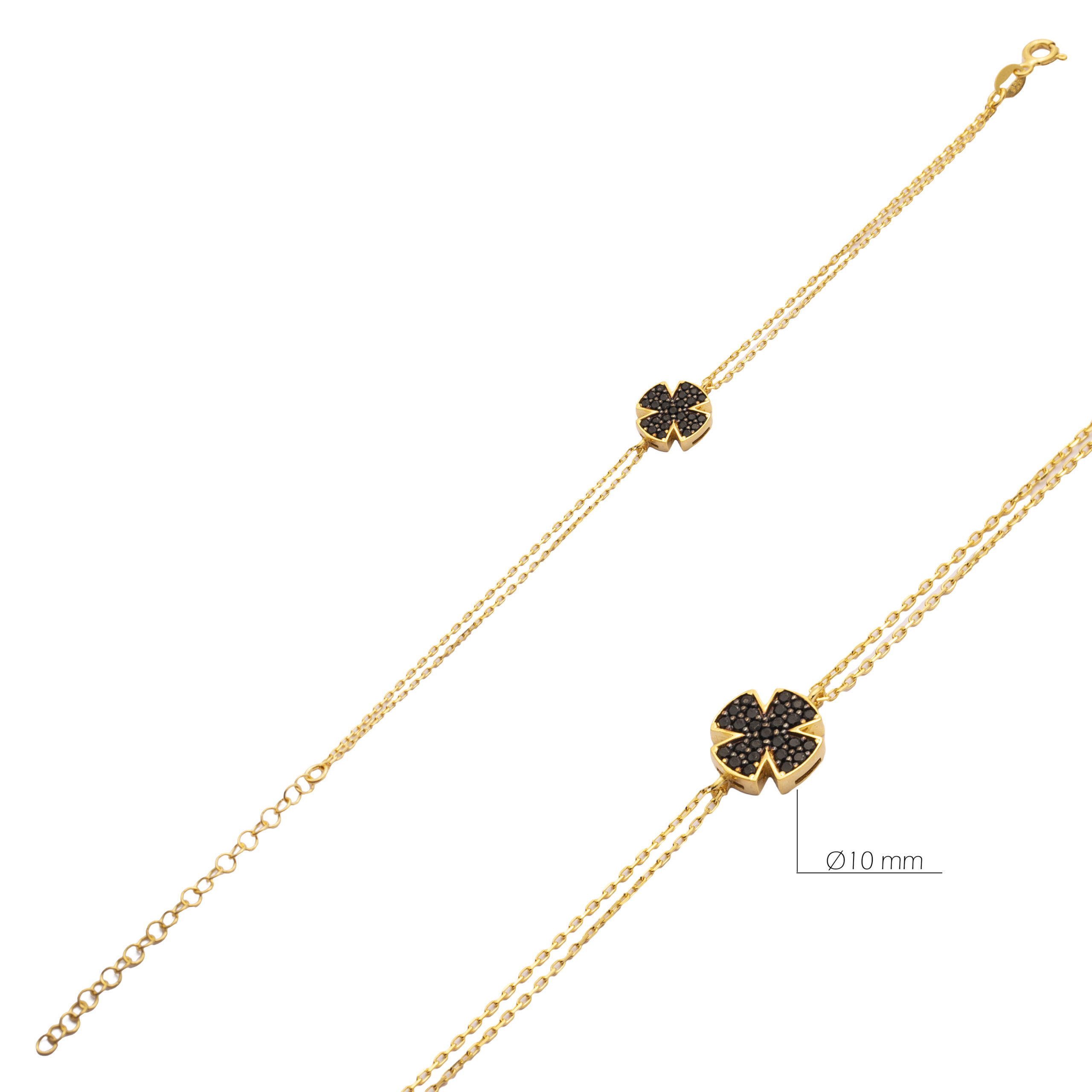 Bracelet quadrilobe en argent 925 doré or 16k, pavage de zirconium noir, double chaîne forçat. Élégance minimaliste et mystique.