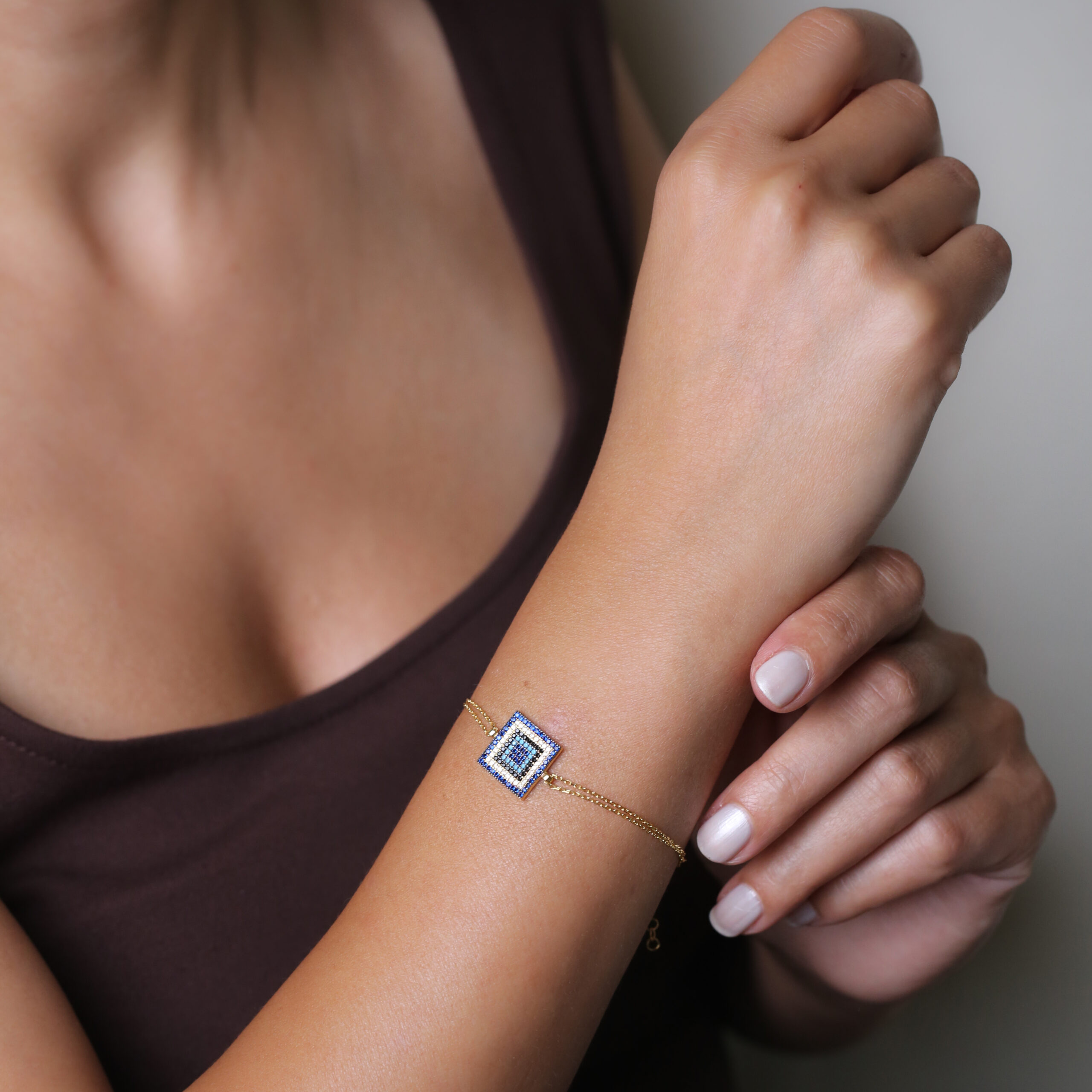 Le bracelet Labyrinthe d’Istanbul capture l’essence des ruelles entremêlées et des mosaïques sacrées de la ville aux mille coupoles. Loin du Nazar circulaire classique, l’artisanat anatolien propose ici une lecture architecturale : un œil protecteur stylisé en carré, évoquant les fresques de marbre où chaque ligne marque une croisée des chemins. La signature Turquaz fige aujourd'hui ce dédale symbolique dans l’excellence de l’argent 925 massif, bâtissant un pont intemporel entre les mystères du Bosphore et le raffinement de la mode contemporaine.