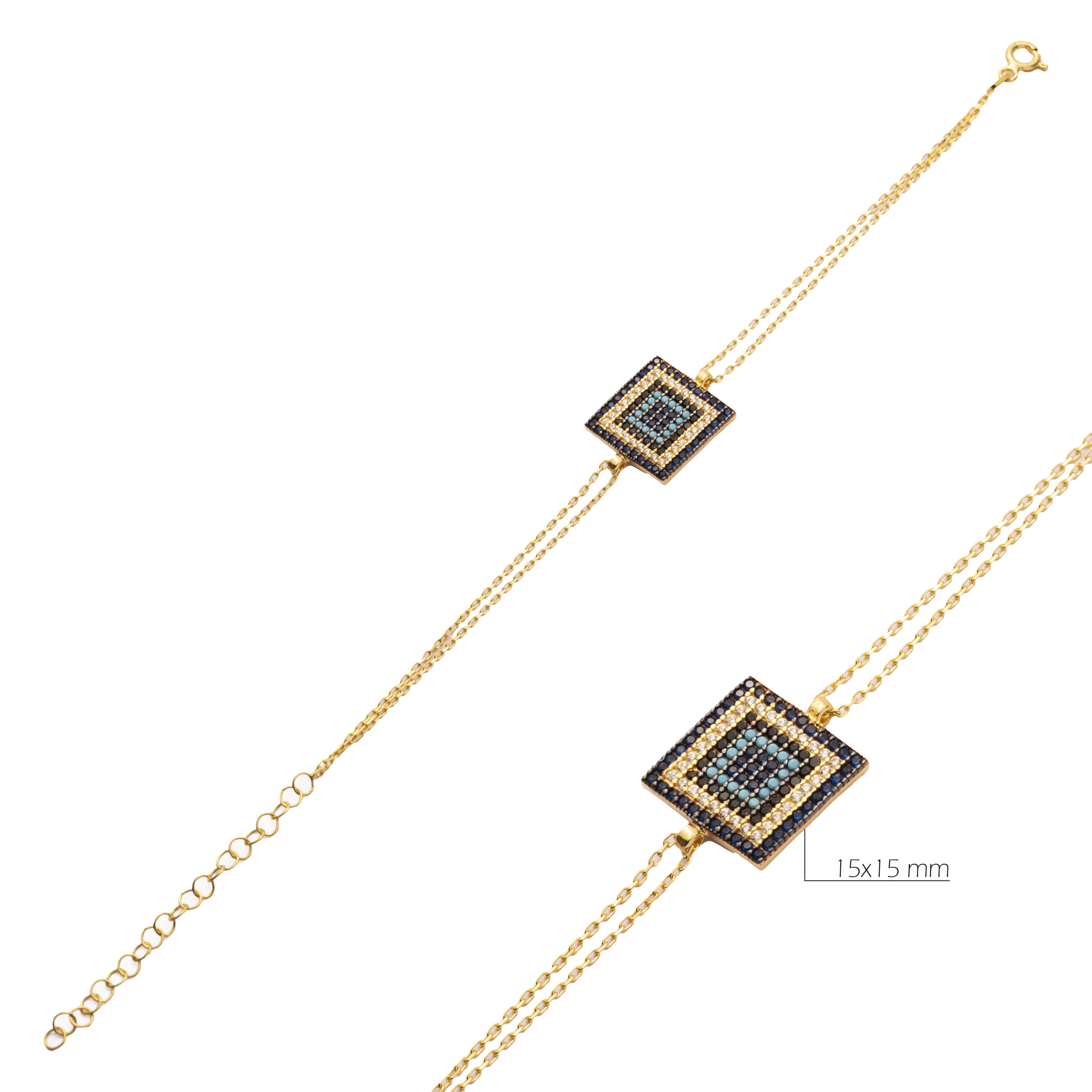 Bracelet Labyrinthe d’Istanbul en argent 925 doré or 16 carats, à double chaîne et motif central géométrique façon “Nazar Mosaïque”, pavé de cristaux multicolores (turquoise blanc et noir), fabriqué à la main à Istanbul.