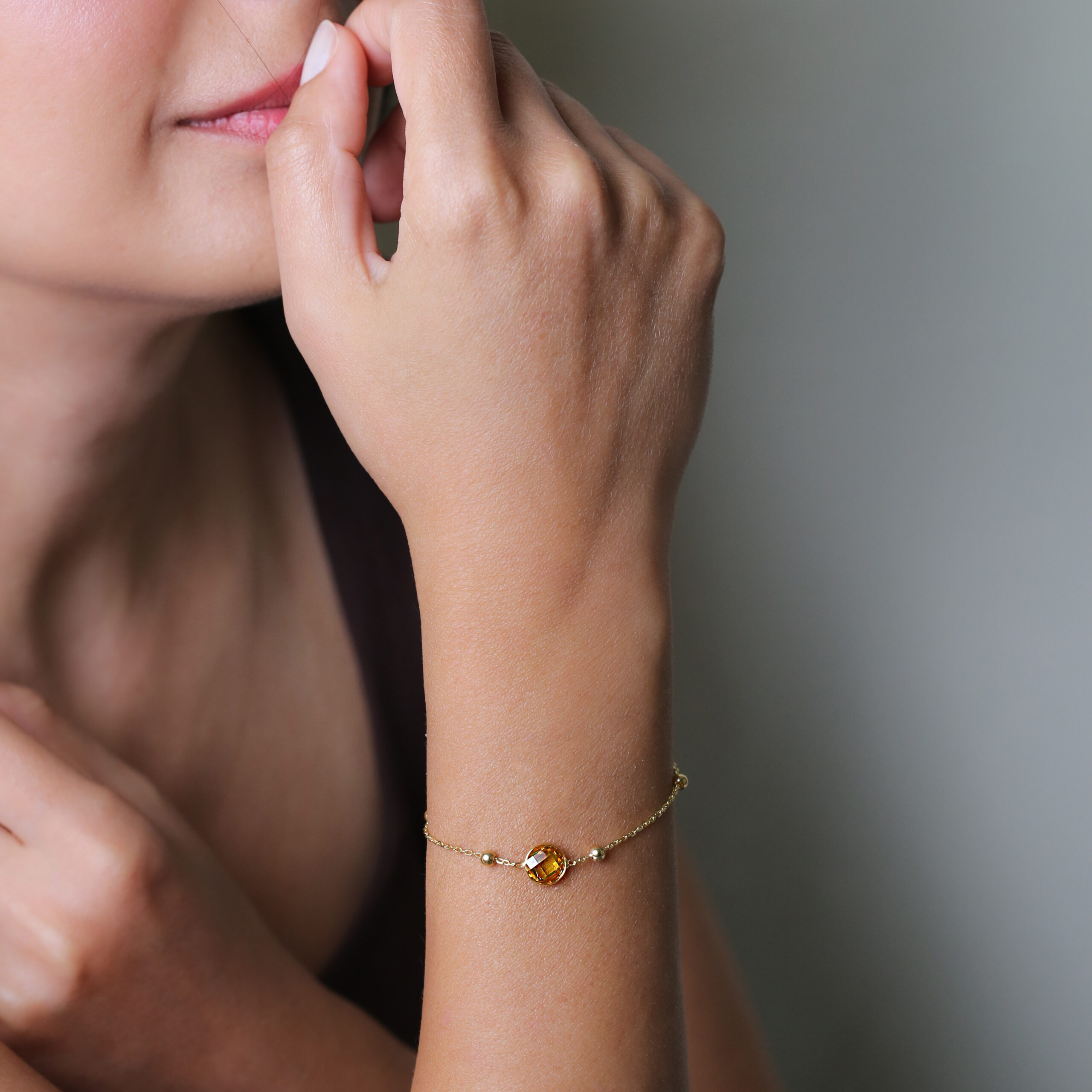 Bracelet minimaliste en argent 925 doré or 16k, pierre citrine facettée en serti clos. Bijou lumineux inspiré de la Méditerranée.