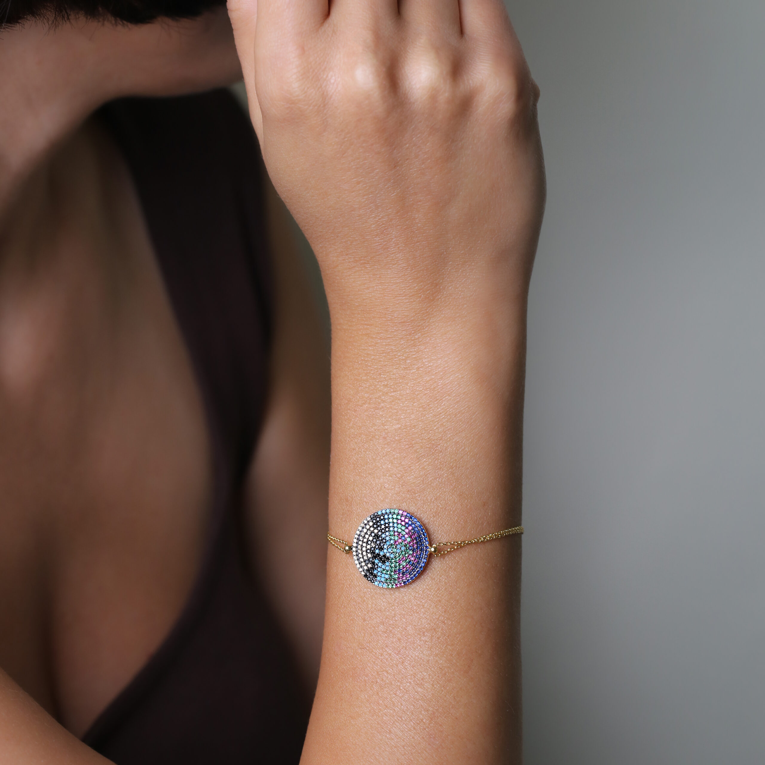 Bracelet Médaillon d’Ebru réglable en argent 925 doré or 16 carats. Son médaillon rond, pavé de cristaux multicolores, s’inspire de l’art traditionnel turc Ebru (papier marbré). Pièce entièrement façonnée à la main en Turquie.