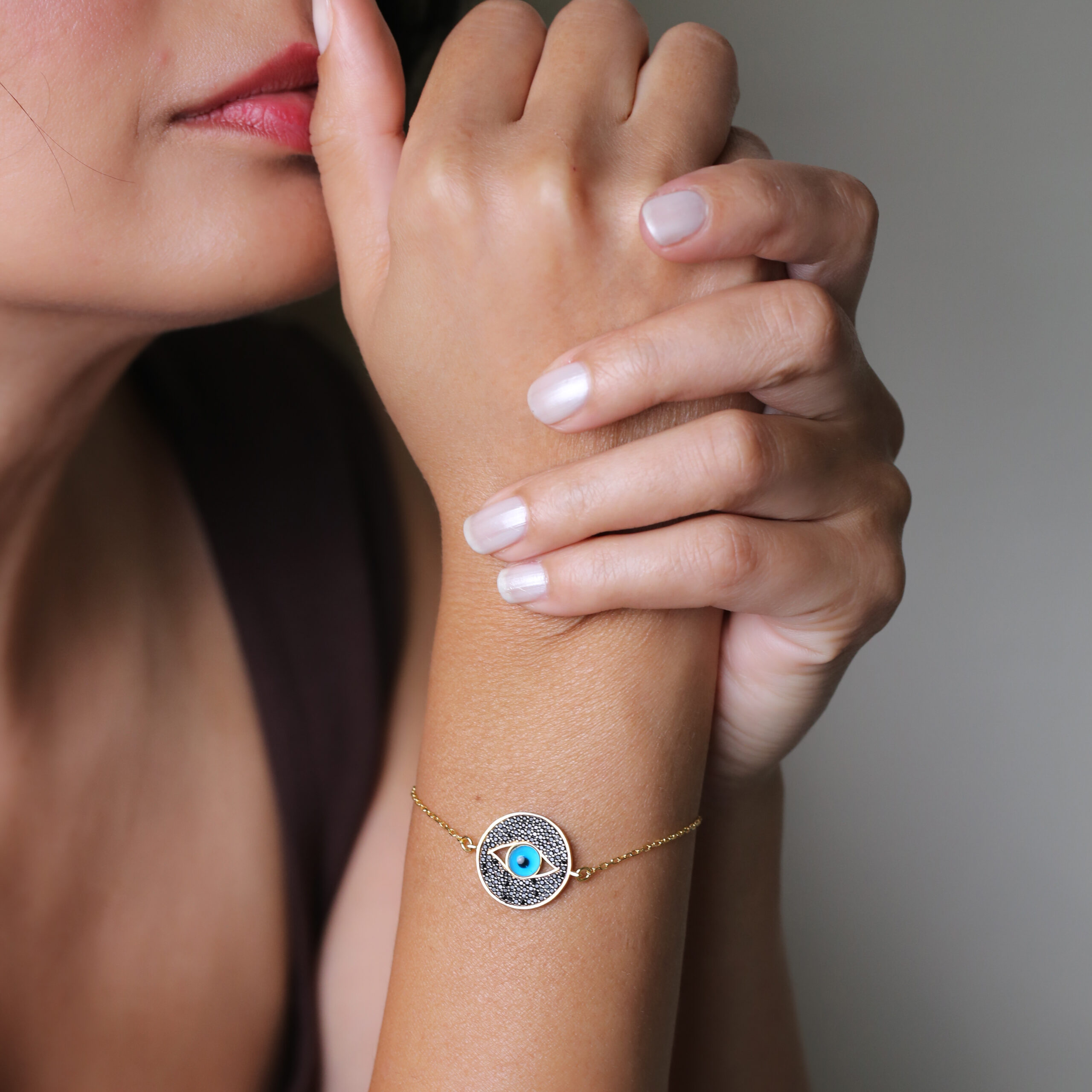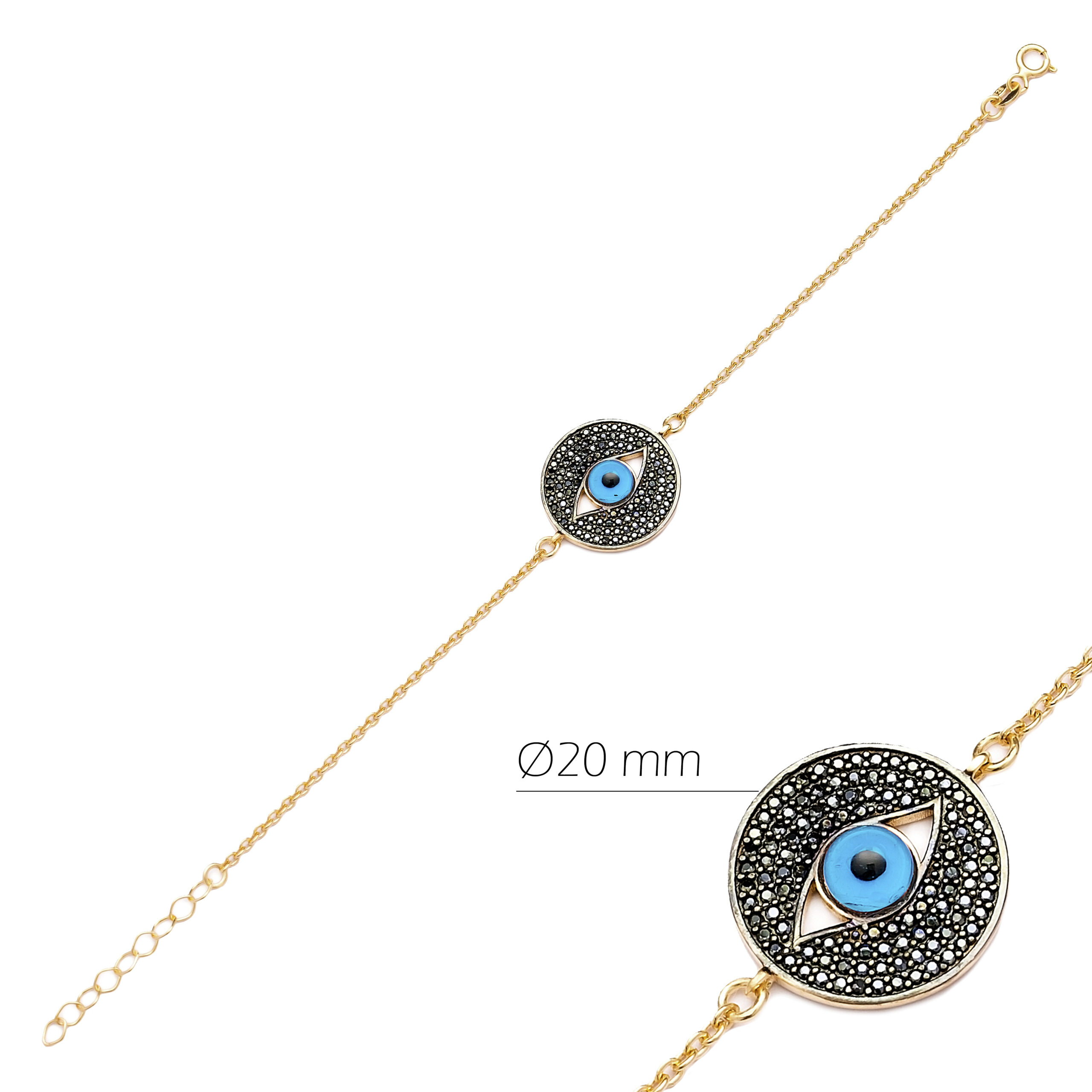 Bracelet talisman Nazar en argent 925 doré or 16k, pavé de zircons noirs avec perle turquoise centrale. Protection élégante et design néo-ottoman.