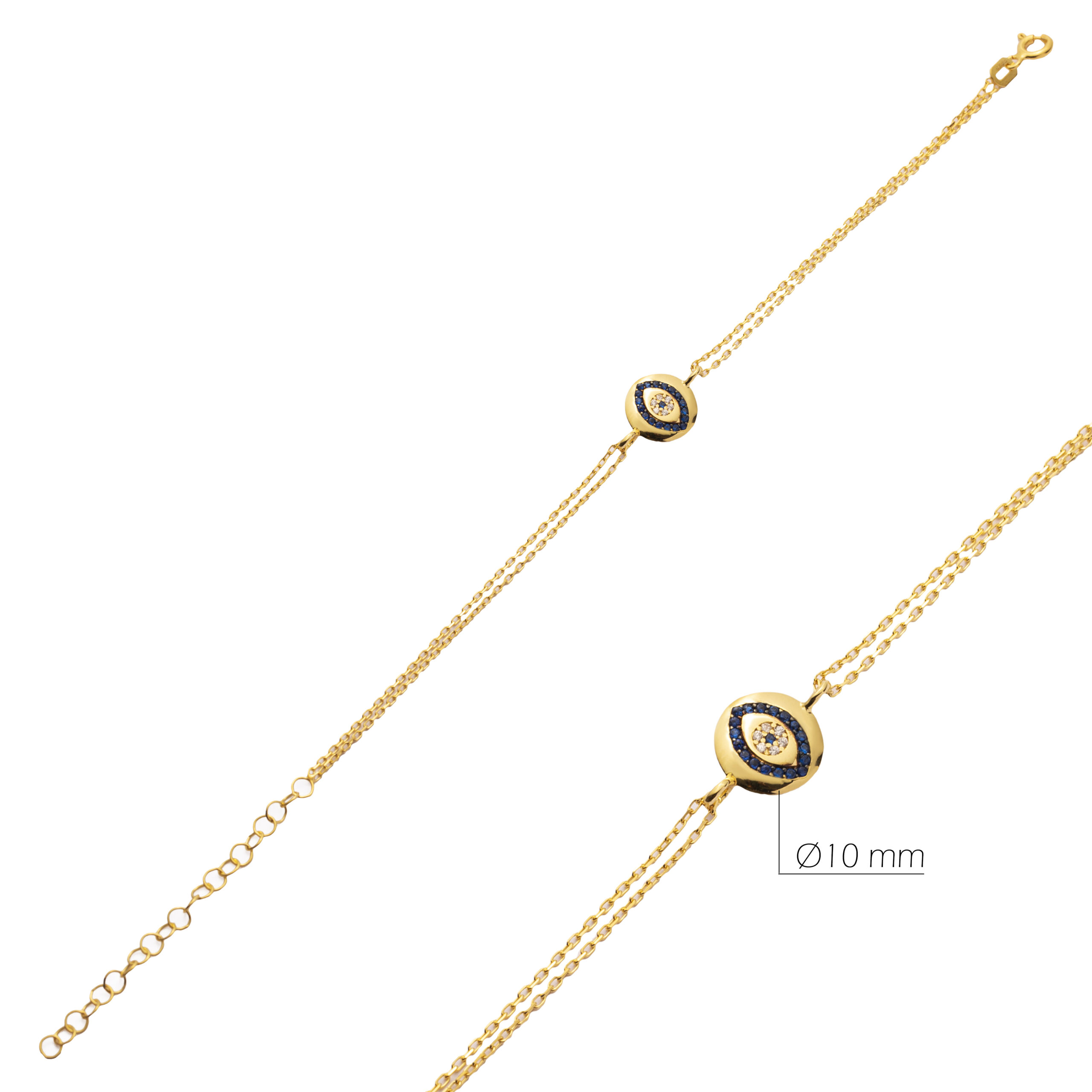Bracelet chaîne en argent 925 doré or 16k, orné d’un Nazar rond pavé de saphir et d’oxydes de zirconium blancs. Talisman protecteur qui accompagne chaque geste.