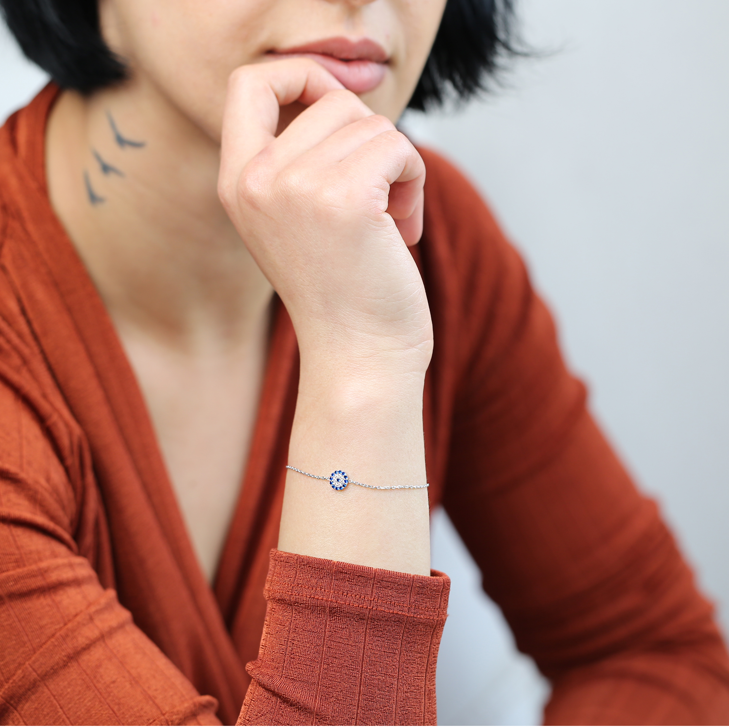 Le Bracelet Nazarina Essentiel en argent 925 rhodié déploie un Nazar lumineux orné d’un pavage bleu profond.