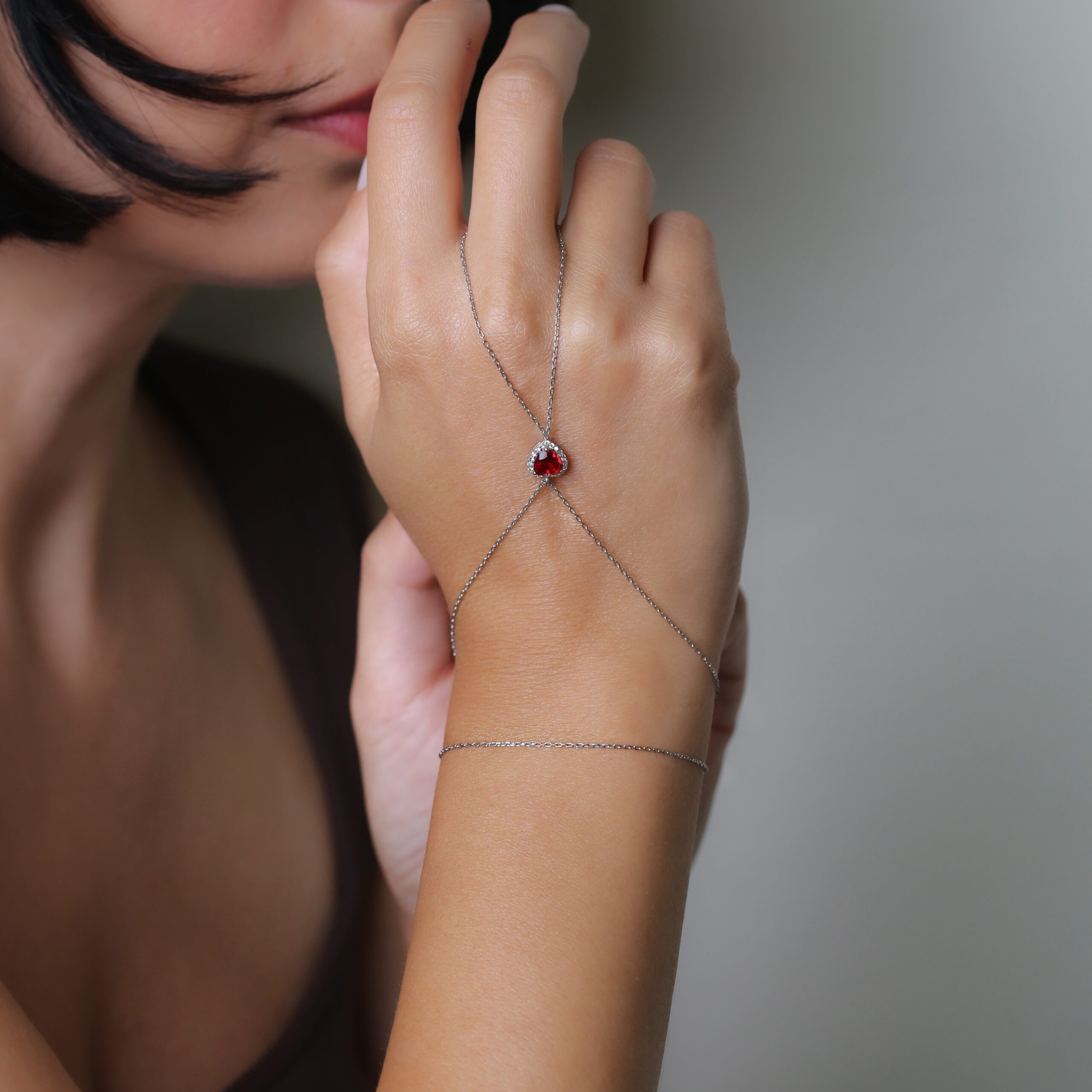 Chaîne de main en argent 925 rhodié, ornée d’un oxyde de zirconium rouge grenat en forme de cœur et d’un halo scintillant, inspirée de la légendaire Şahmeran et façonnée à la main en Turquie.