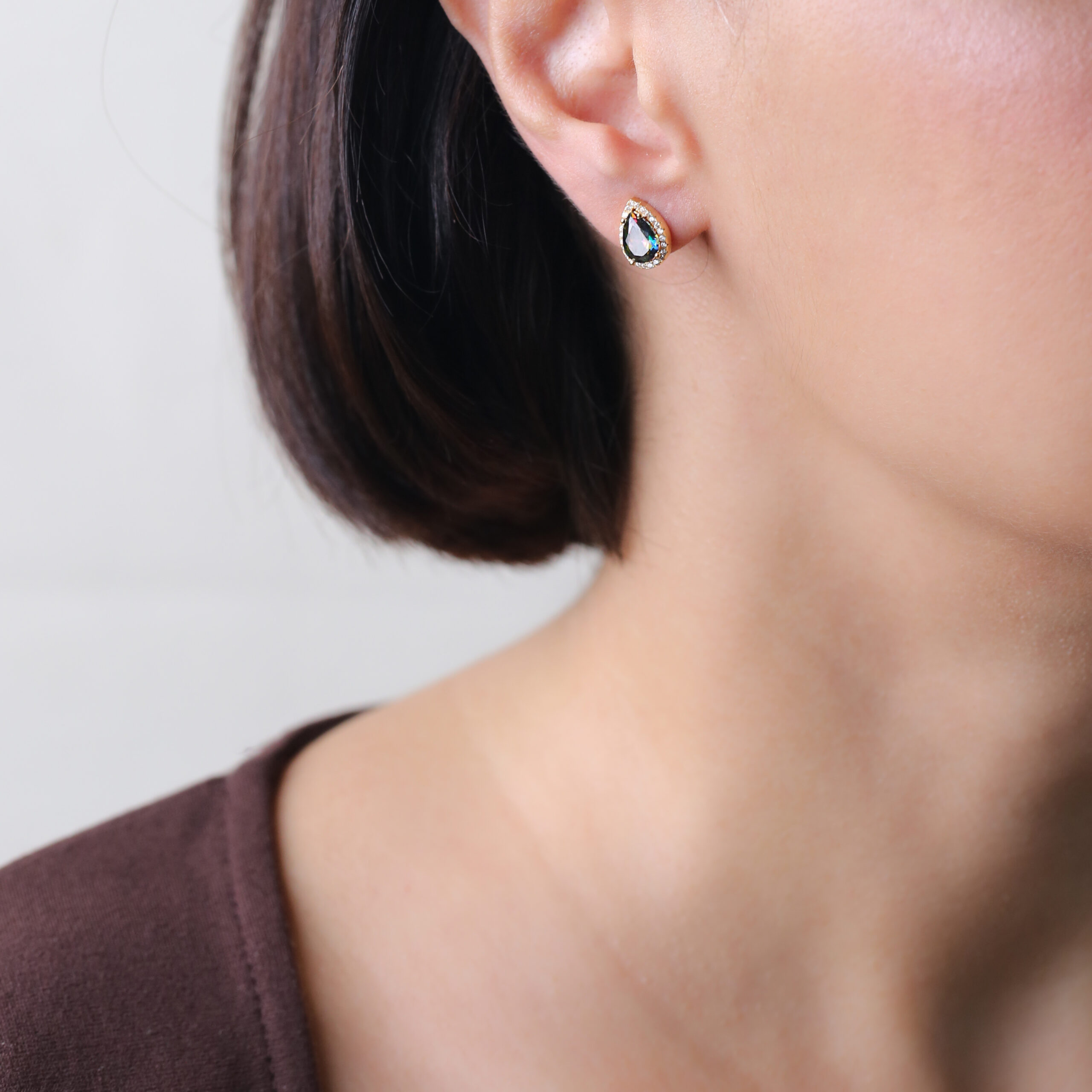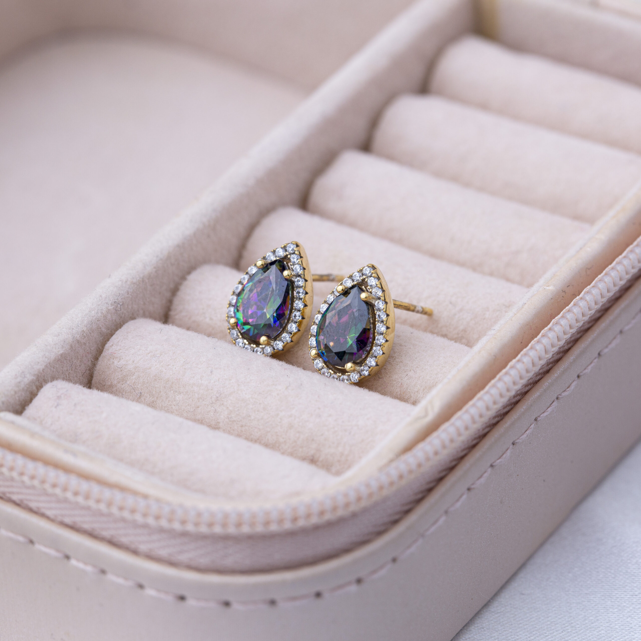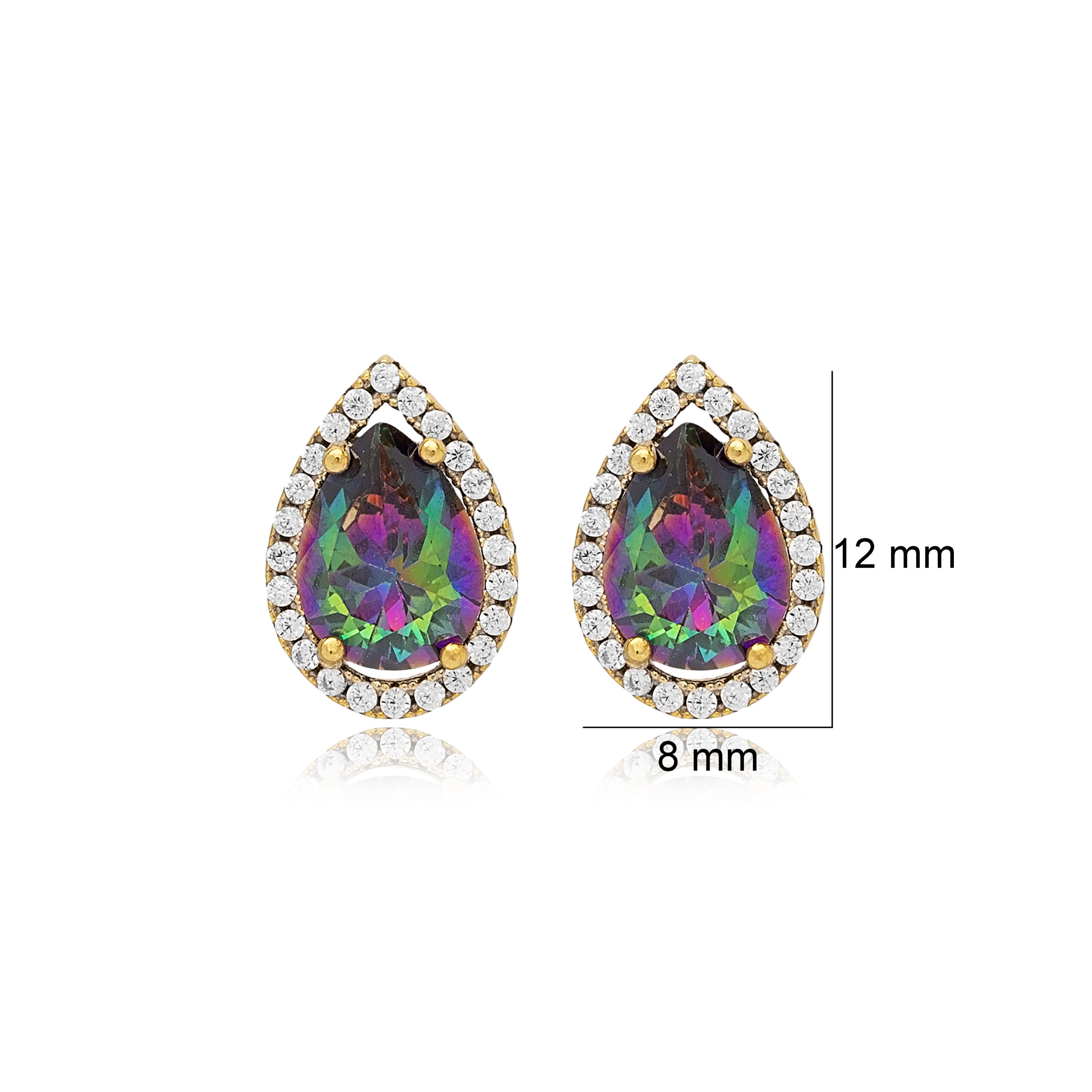 Clous d’oreilles Reyhan Mystique en argent 925 doré or 16K, ornés d’un oxyde de zirconium effet topaze mystique aux couleurs changeantes. Une création lumineuse qui révèle votre aura unique.