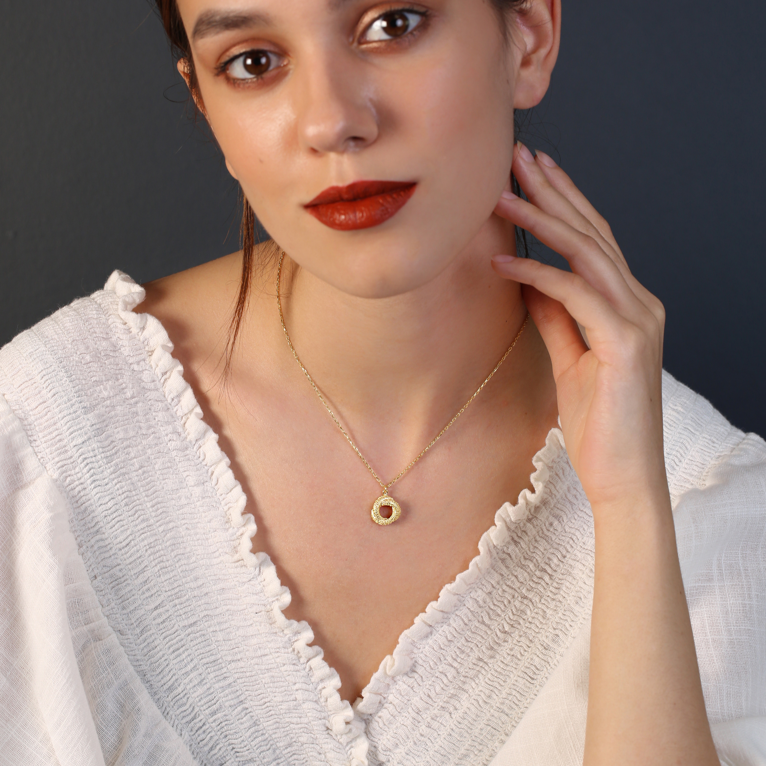 Le Collier Nar d’Eden en argent 925 doré or 16K célèbre l’abondance à travers un pendentif grenade pavé d’oxydes de zirconium grenat et améthyste.