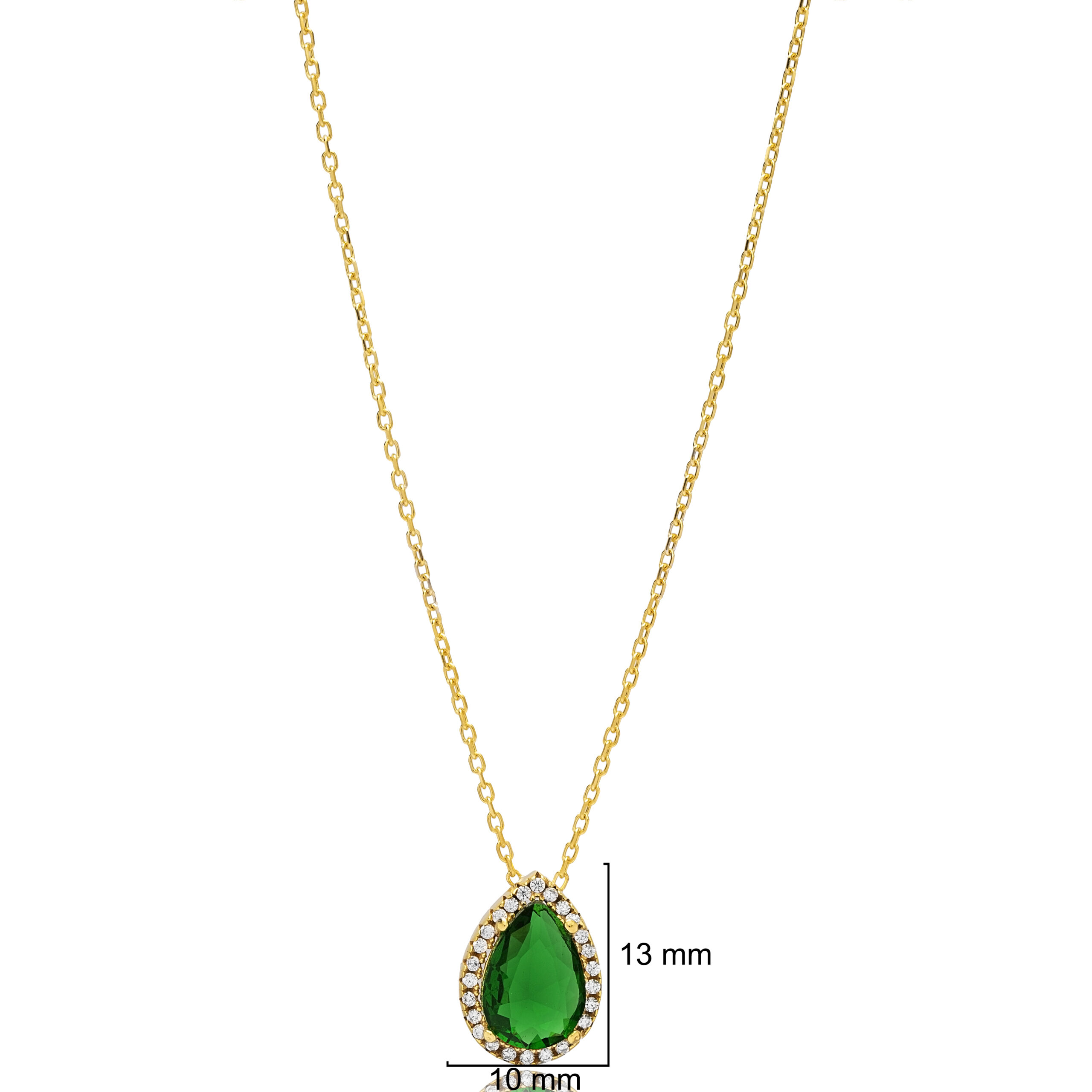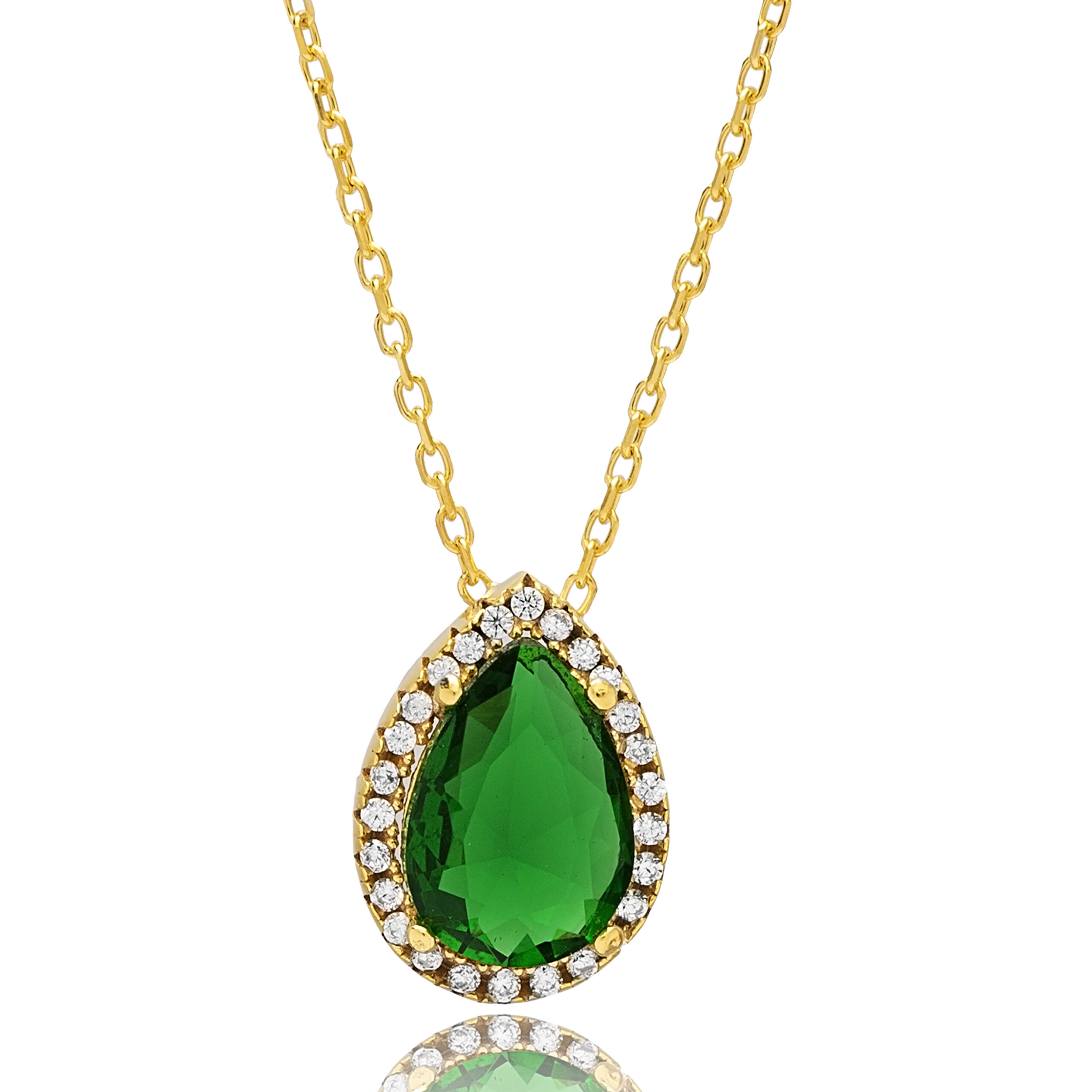 Collier goutte en argent 925 doré or 16k, serti d’un oxyde de zirconium vert type émeraude et d’un halo scintillant de zirconiums blancs. Une création artisanale d’Istanbul inspirée des jardins ottomans.