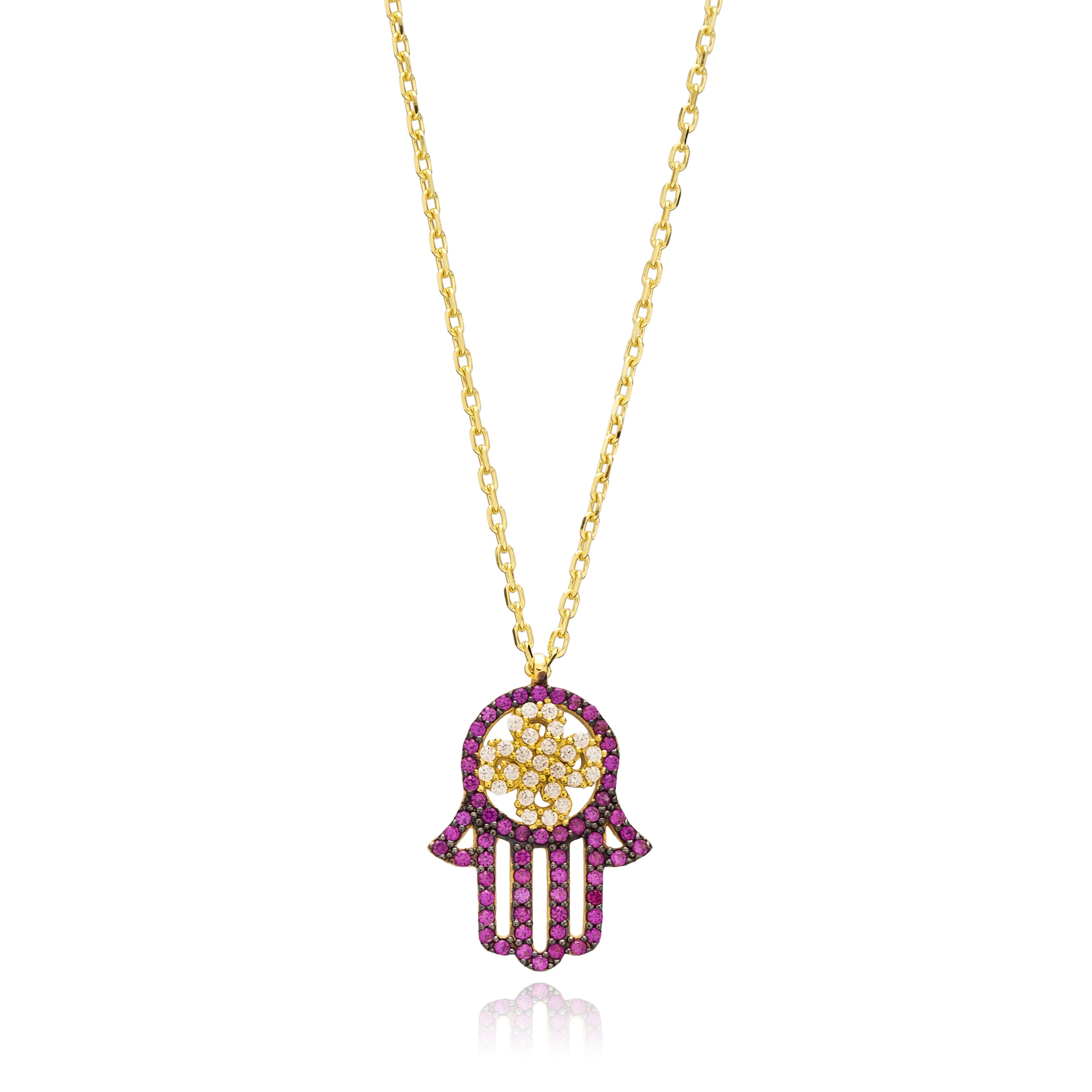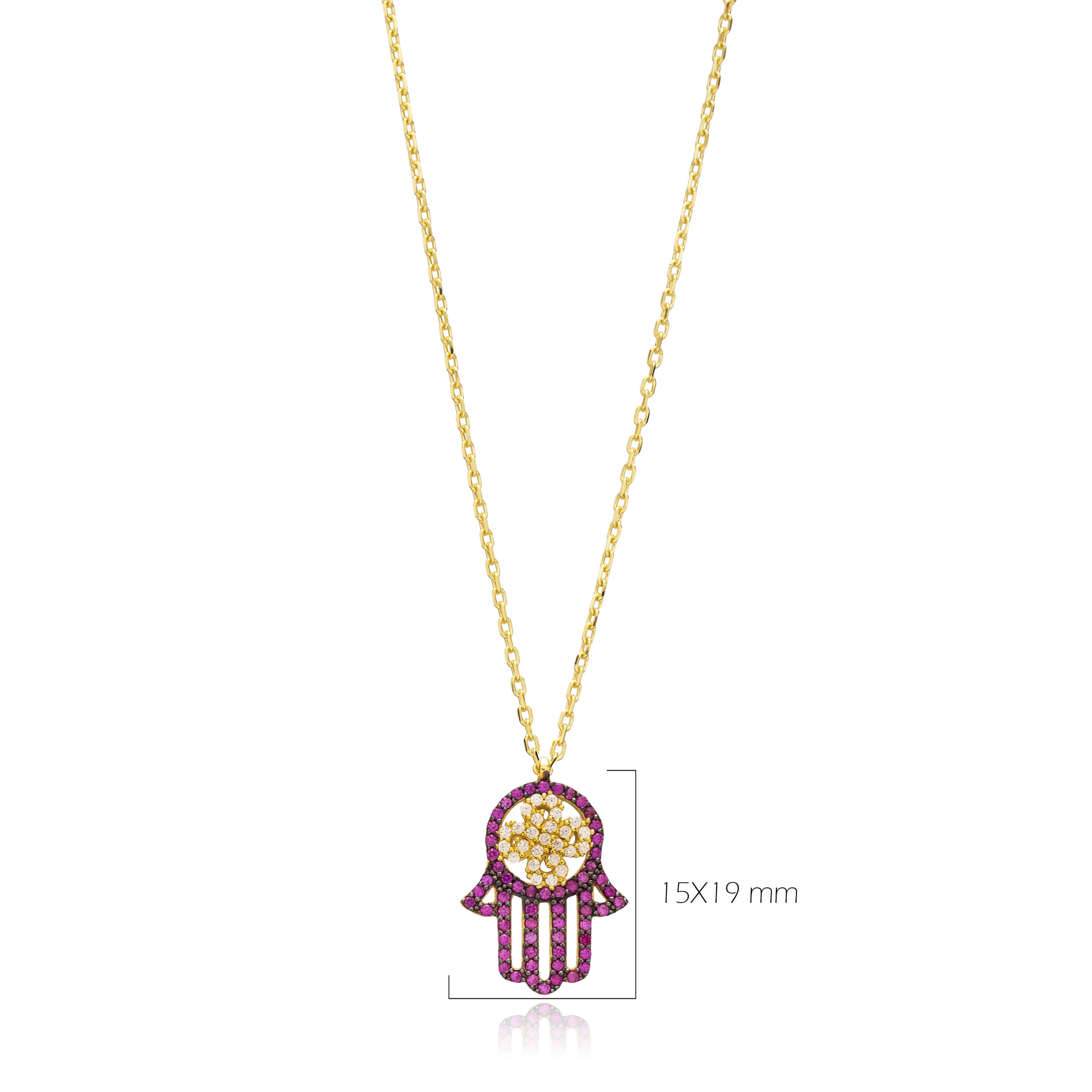 Collier talisman Main de Fatma en argent 925 doré or, pavé de zirconium rubis et blanc, symbole d’abondance et de protection.