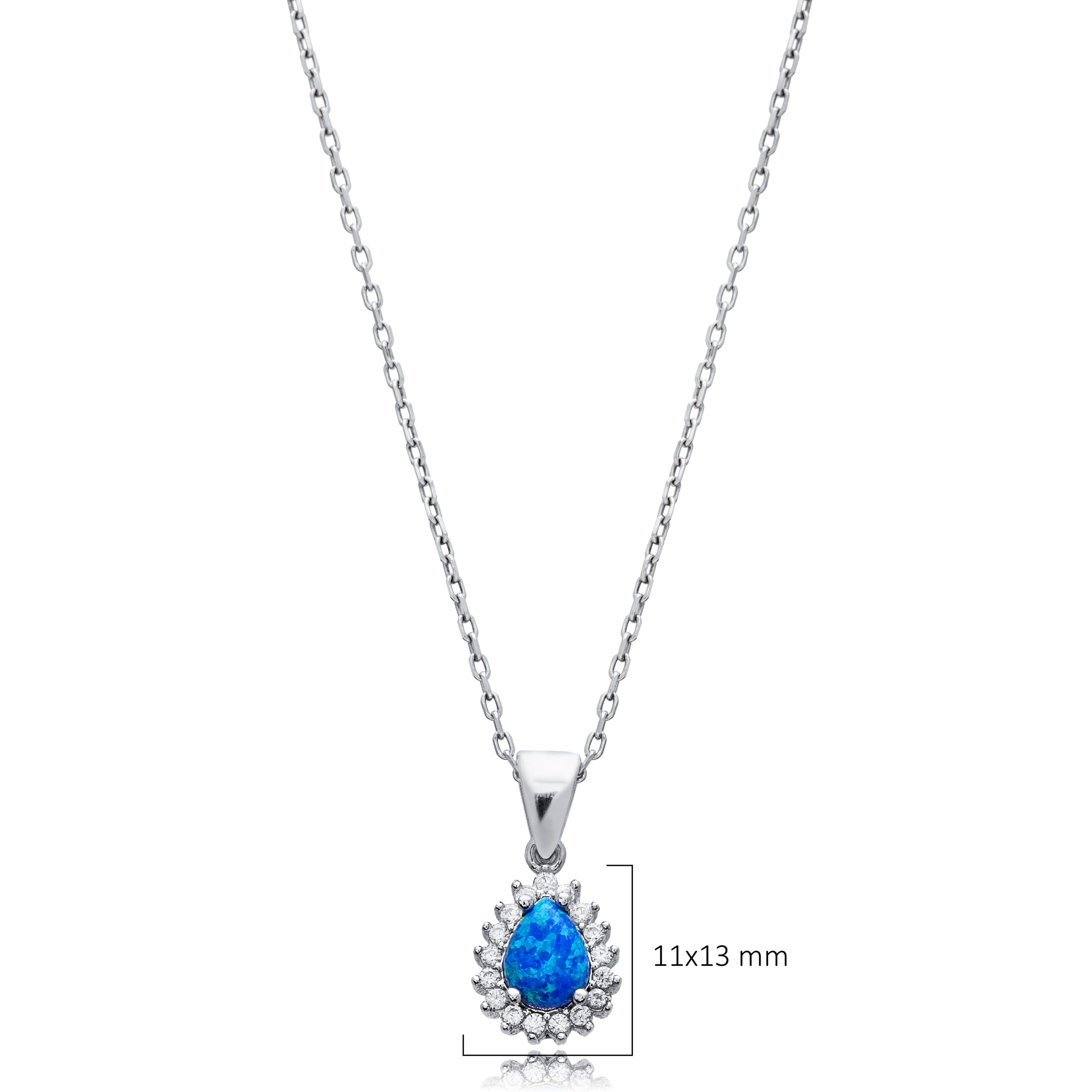 Son pendentif floral stylisé encadre une opale bleu authentique captant la lumière naturelle et se nuance de reflets laiteux et irisés.