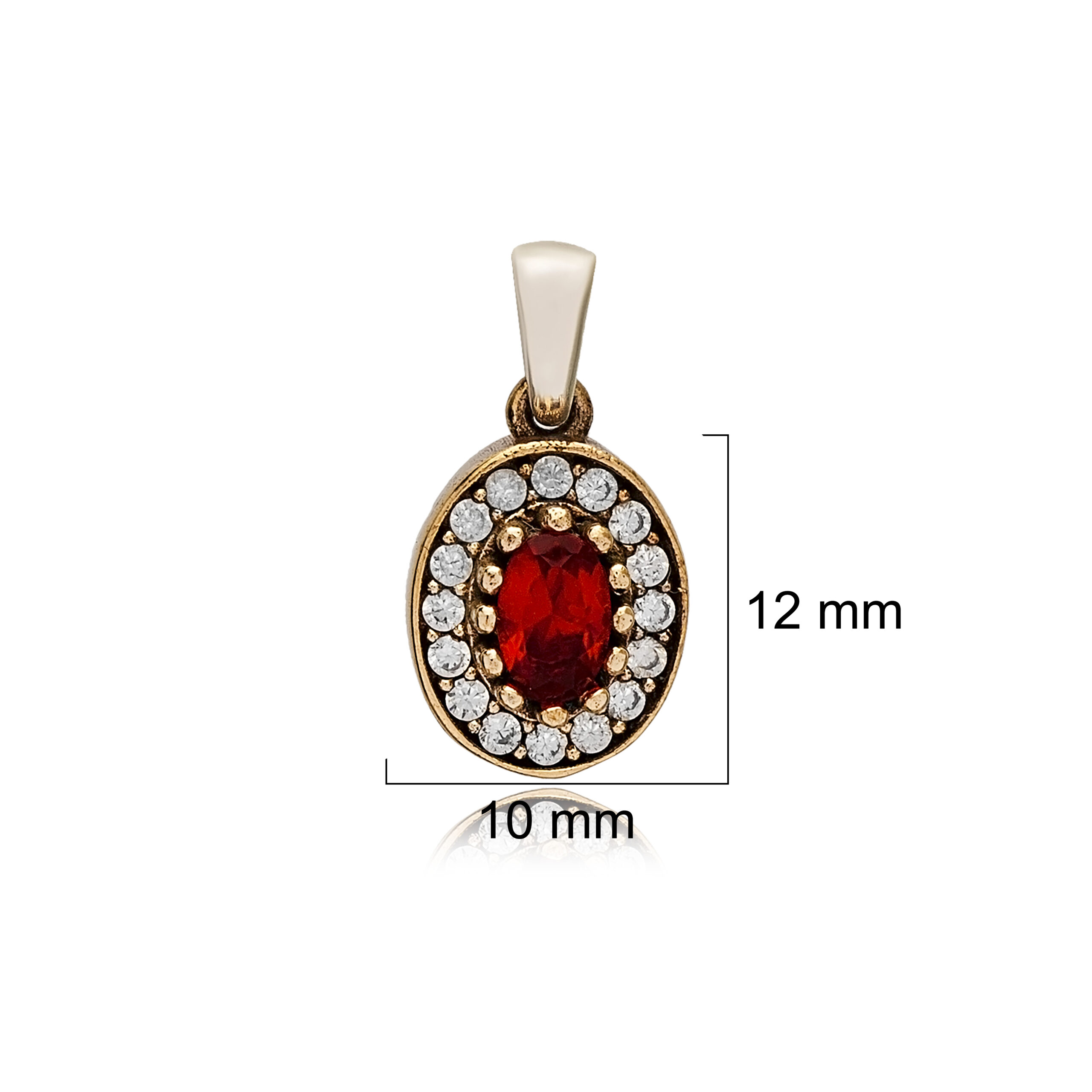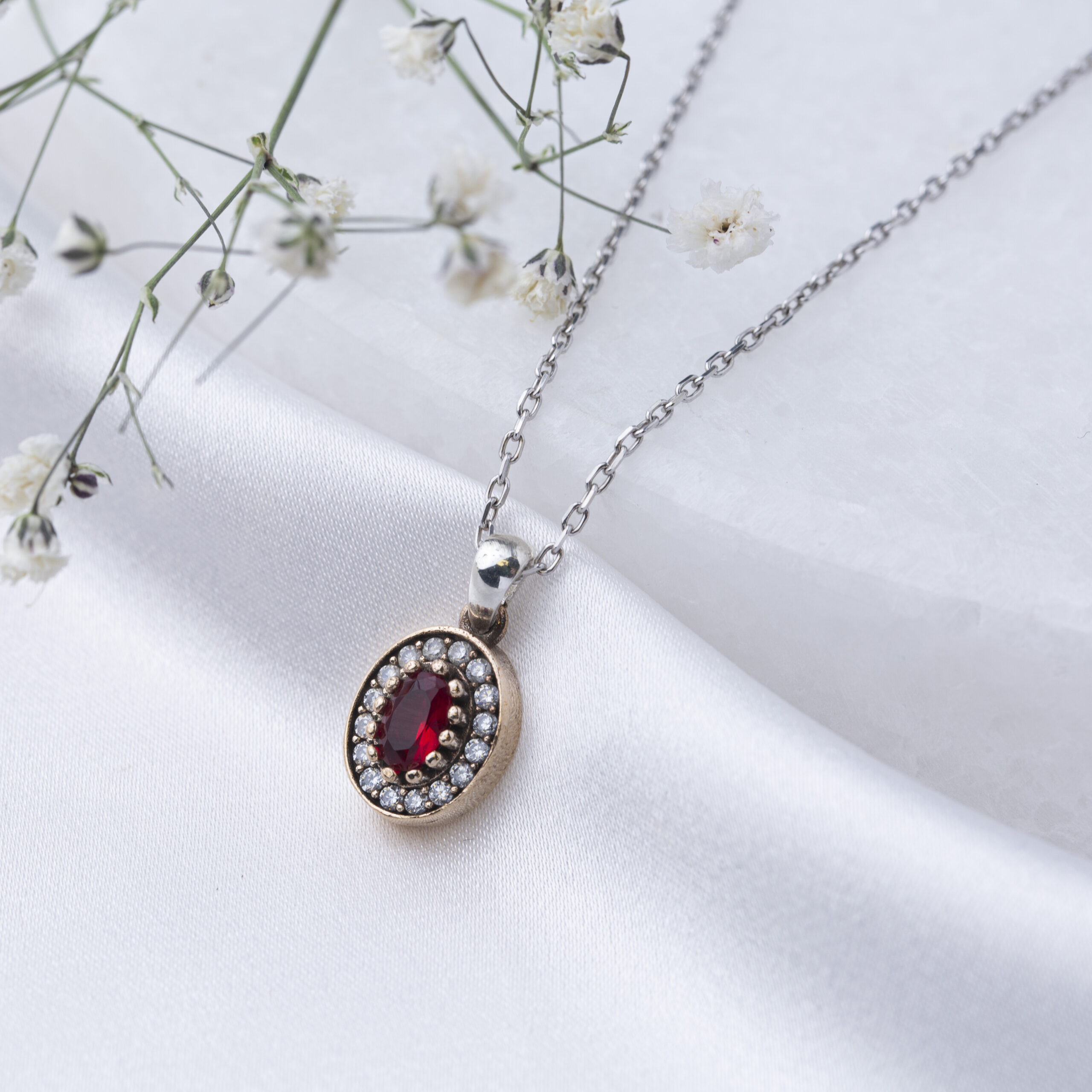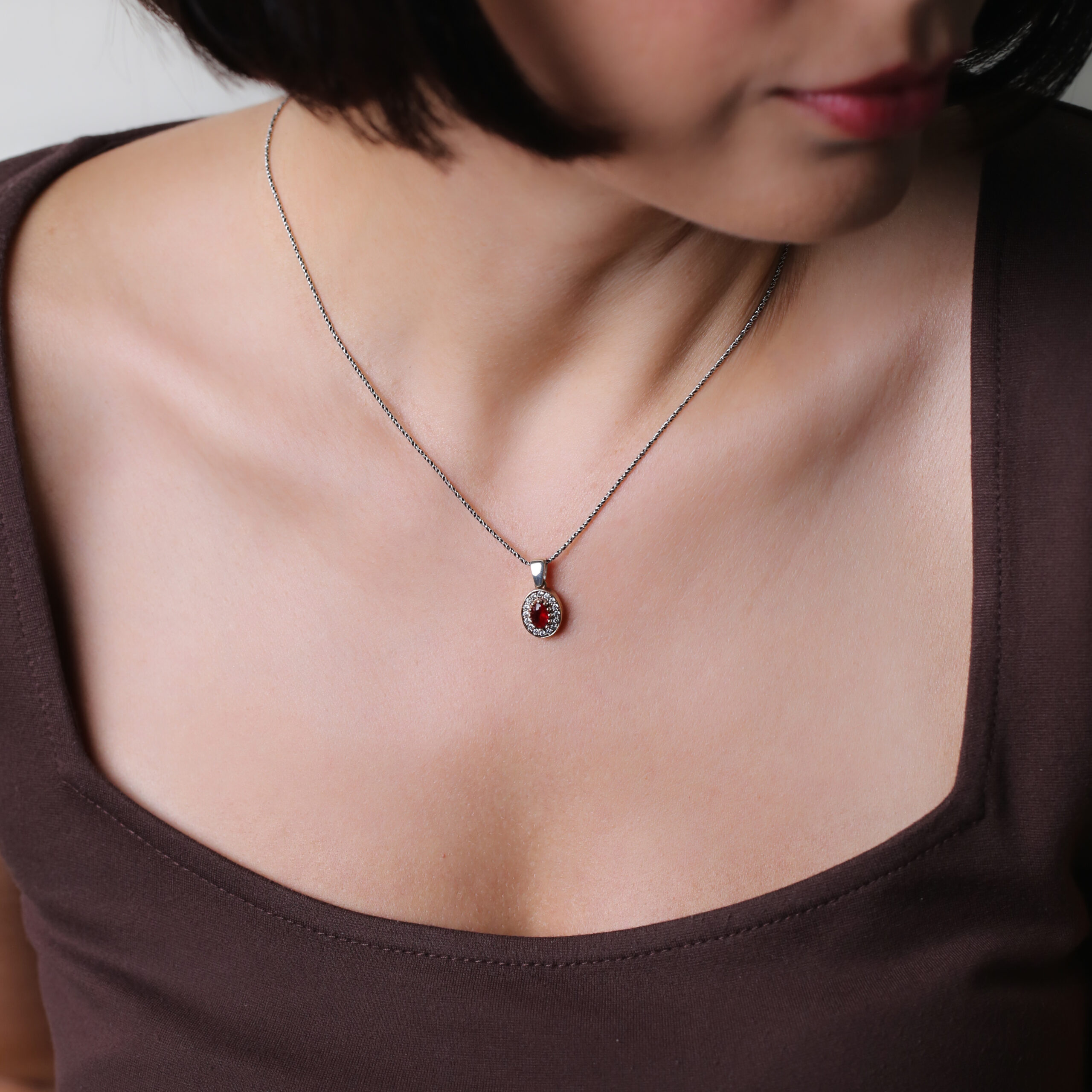 Le pendentif ovale est orné d’un zircon rouge taille ovale, serti à la main et entouré d'oxyde de zirconium clairs pour une diffusion parfaite de la lumière.