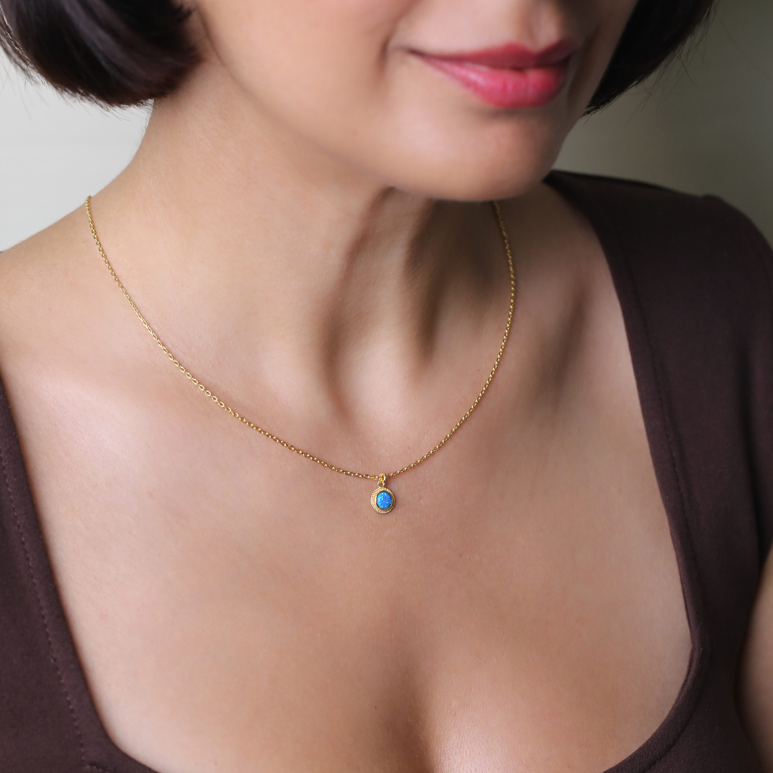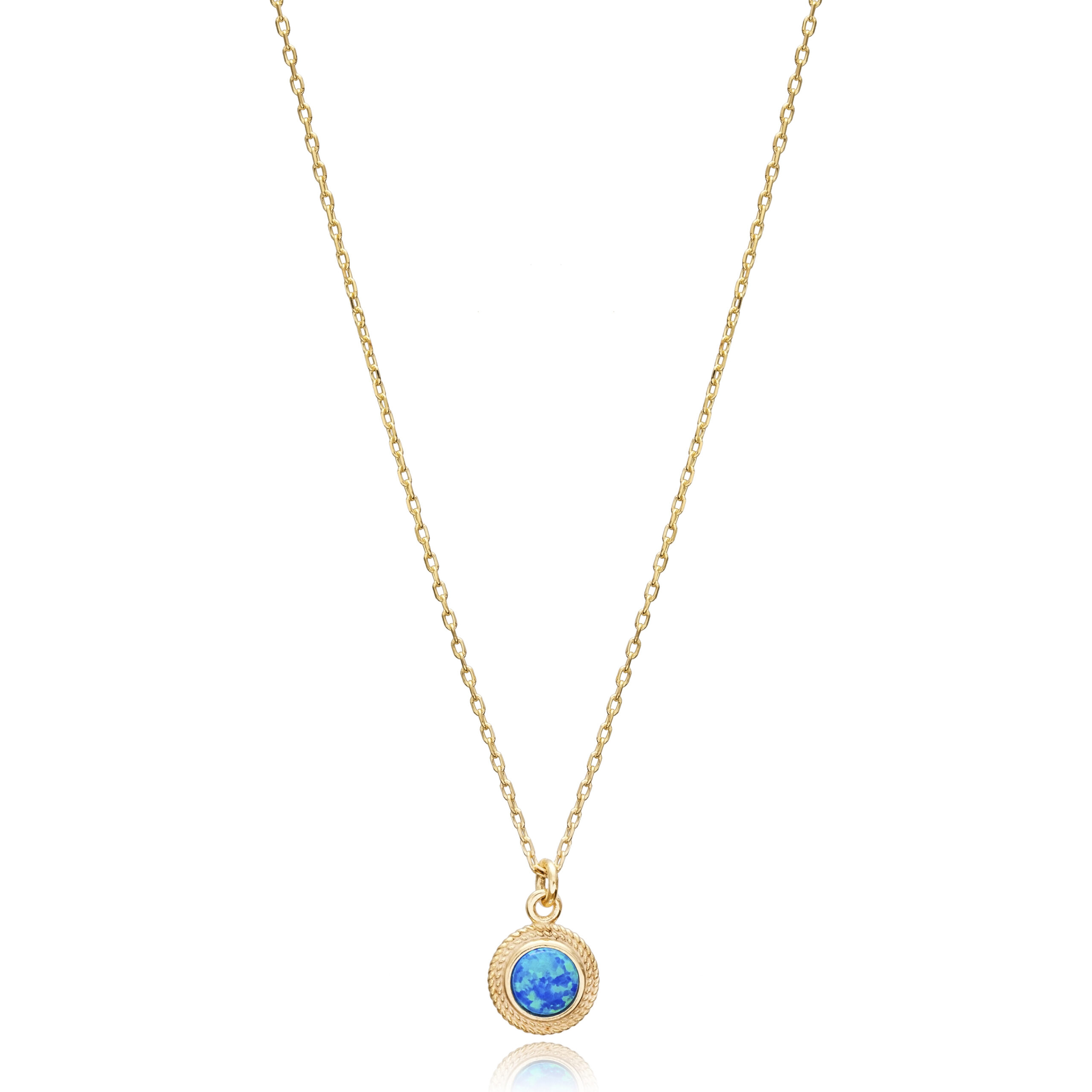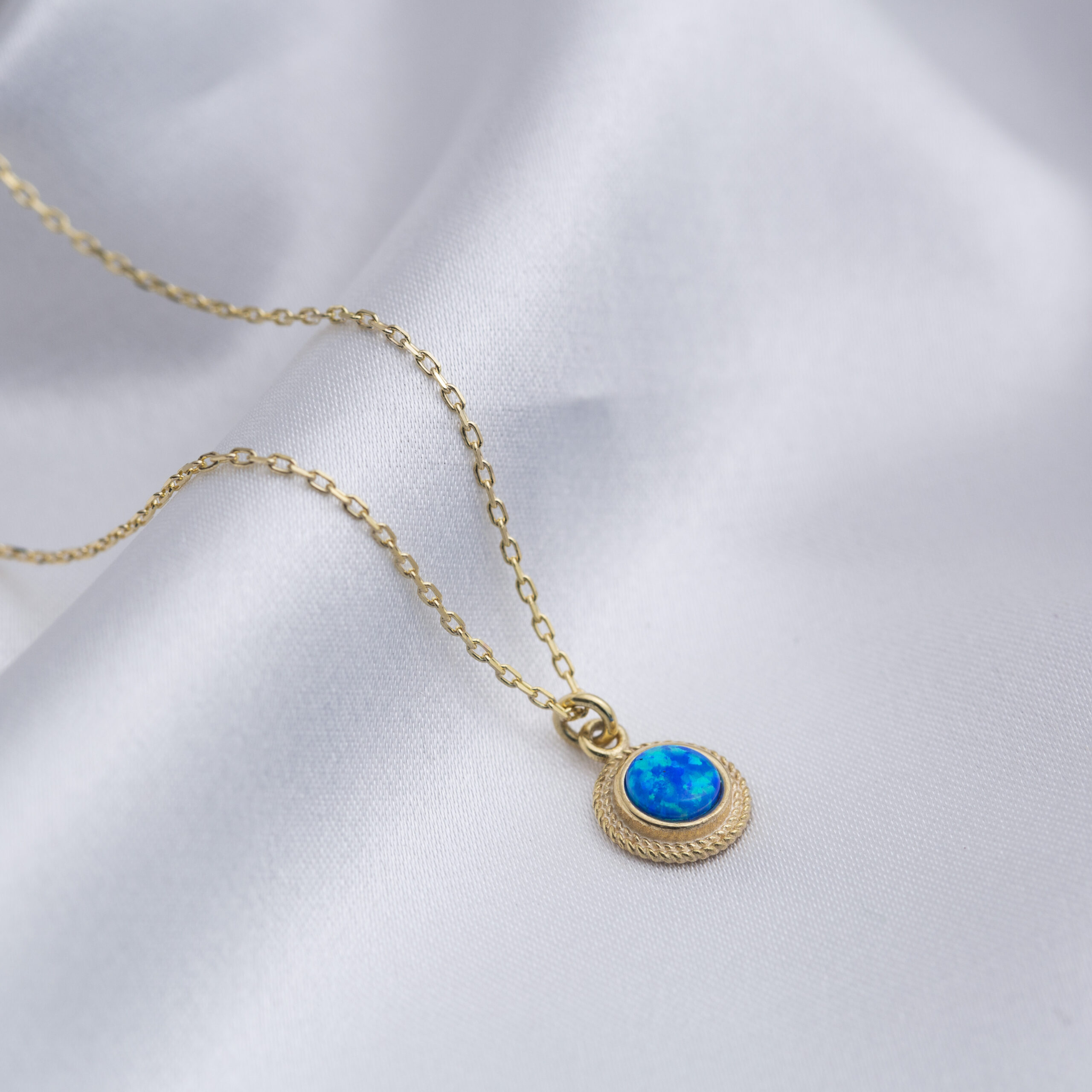 Le Collier Mavi Rûya en argent 925 doré or 16K dévoile une opale bleue véritable aux reflets apaisants dans un médaillon torsadé.