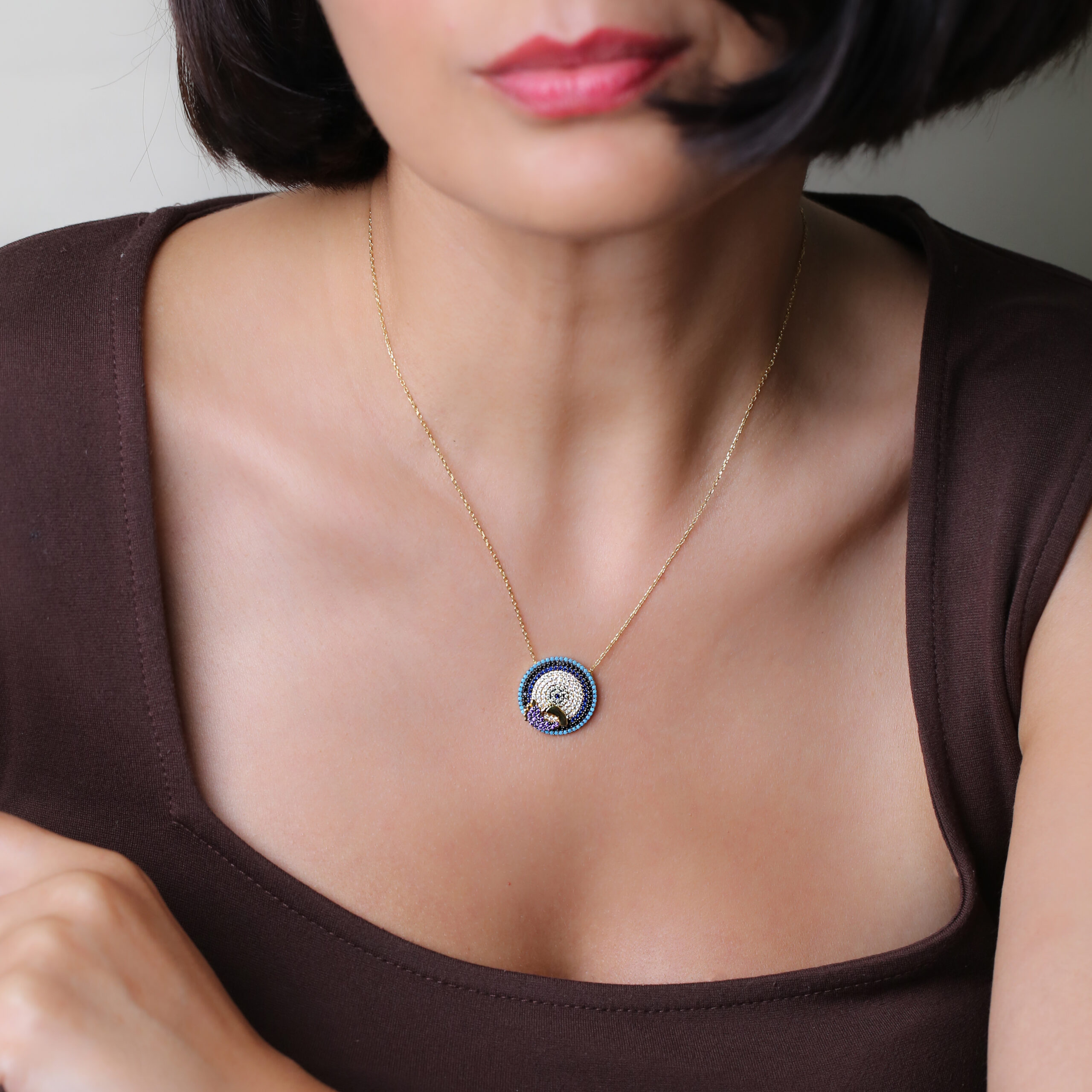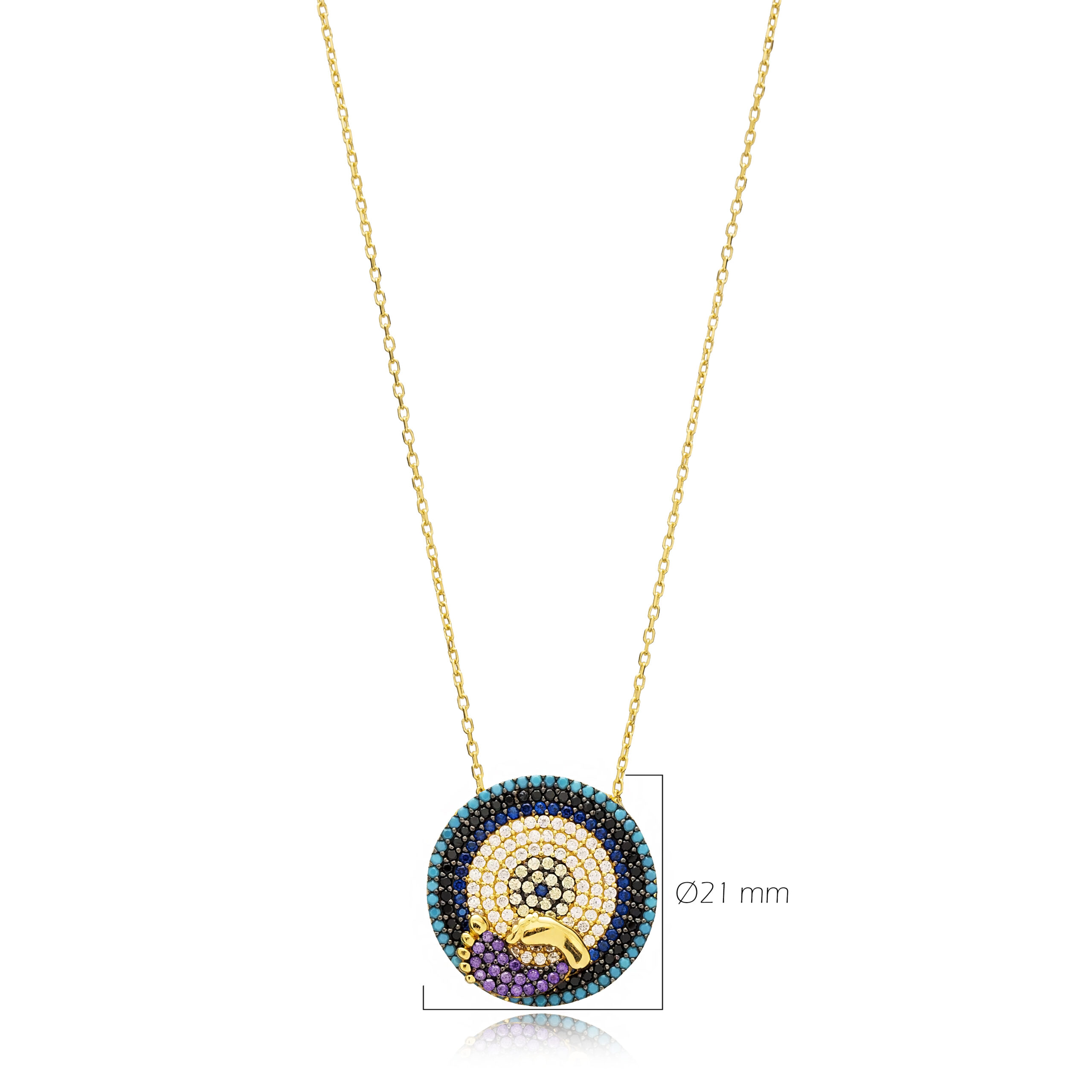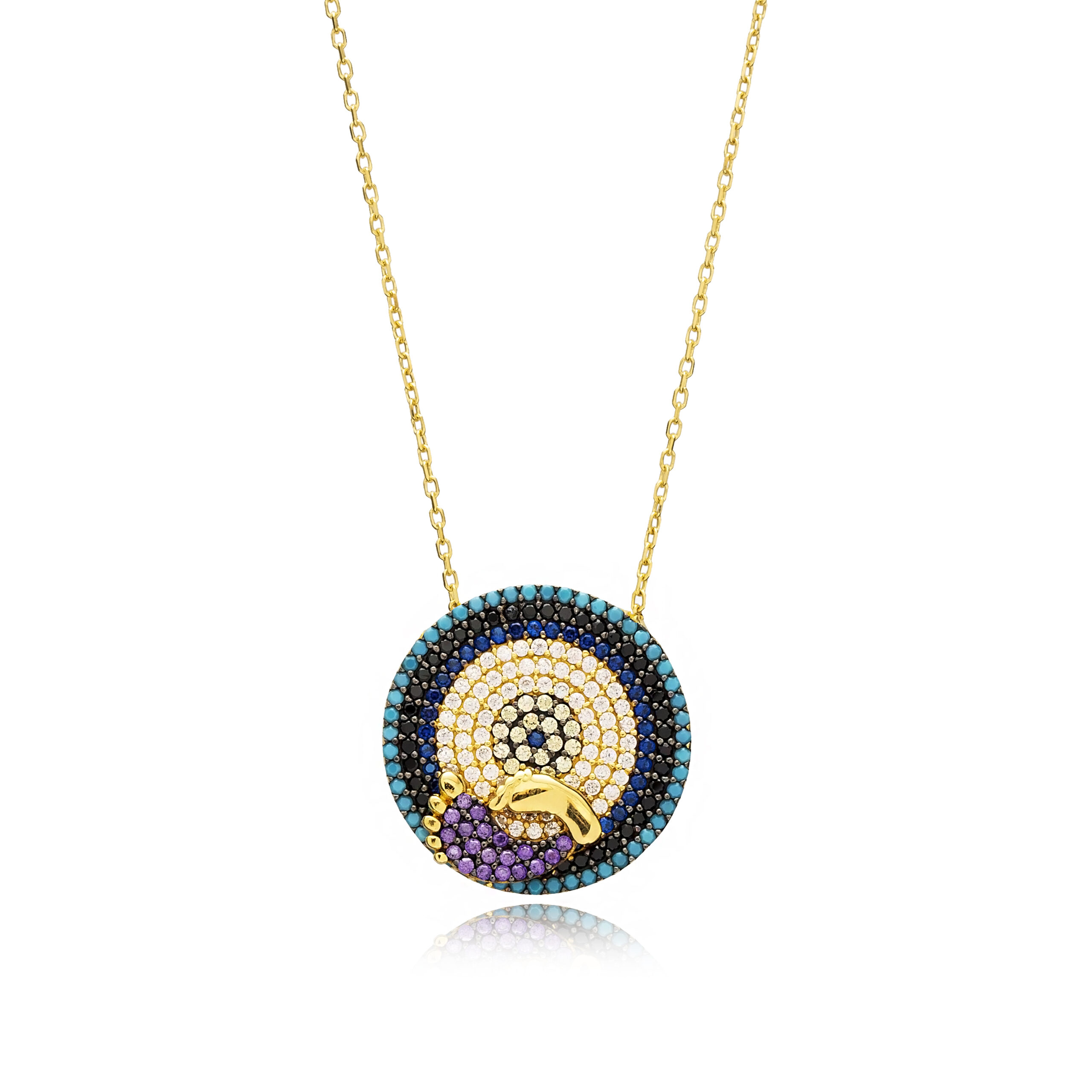 Collier médaille en argent 925 doré or 16 carats, orné d’un “Nazar” pavé de cristaux multicolores (turquoise, noir, bleu et améthyste), rehaussé de deux délicates empreintes de pied : un talisman conçu pour la protection mère‑enfant.