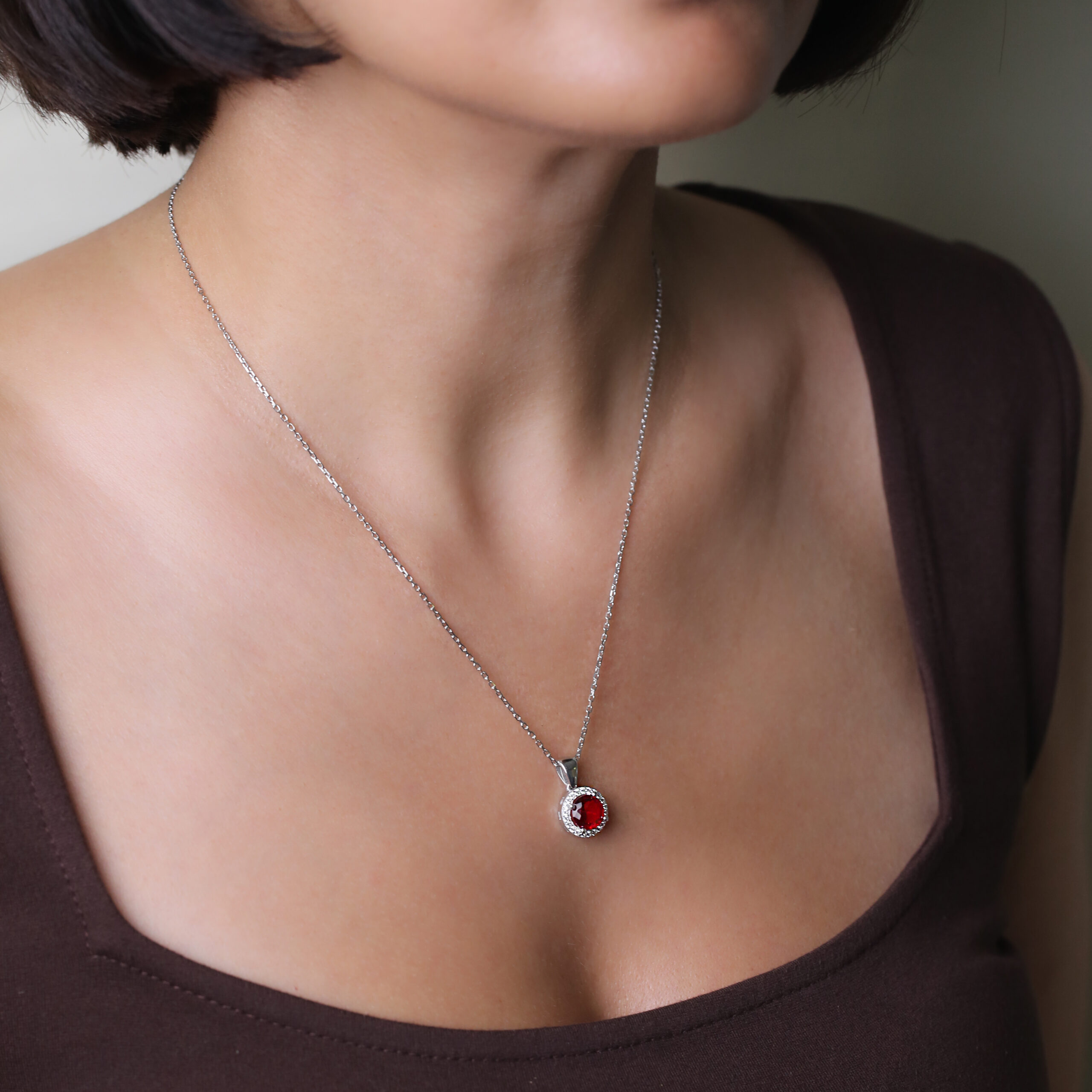 Le pendentif est orné d’un oxyde de zirconium teinté grenat, vibrant et intense, serti par quatre griffes pour une présence lumineuse parfaite. Autour de cette pierre, un halo d’oxydes de zirconium blancs est disposé un à un selon la tradition artisanale turque, offrant un scintillement maîtrisé au moindre mouvement.