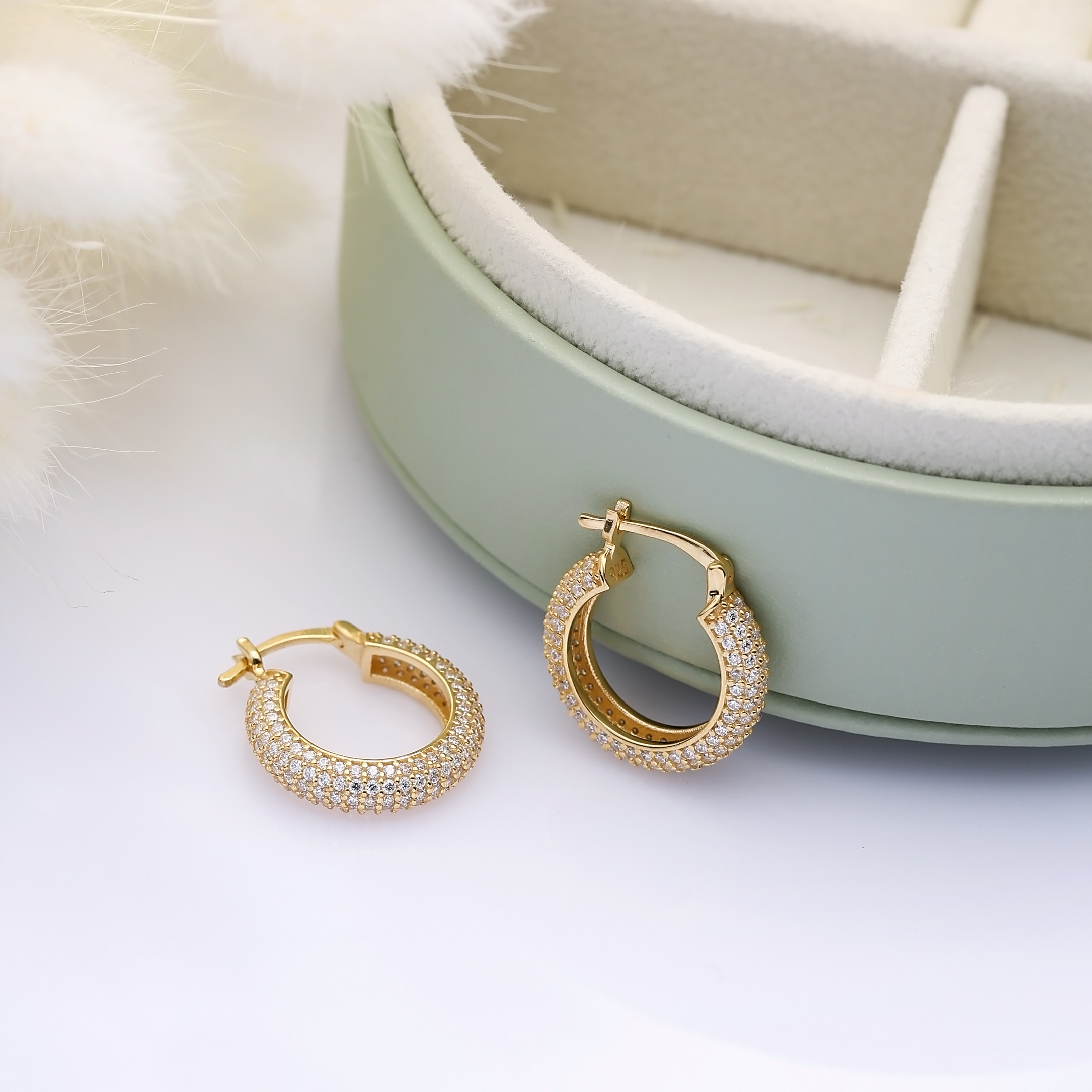 Elles se composent d’une créole “huggie” délicate, entièrement micro-sertie d’oxydes de zirconium clairs, qui épouse parfaitement le lobe pour un maintien élégant et confortable.