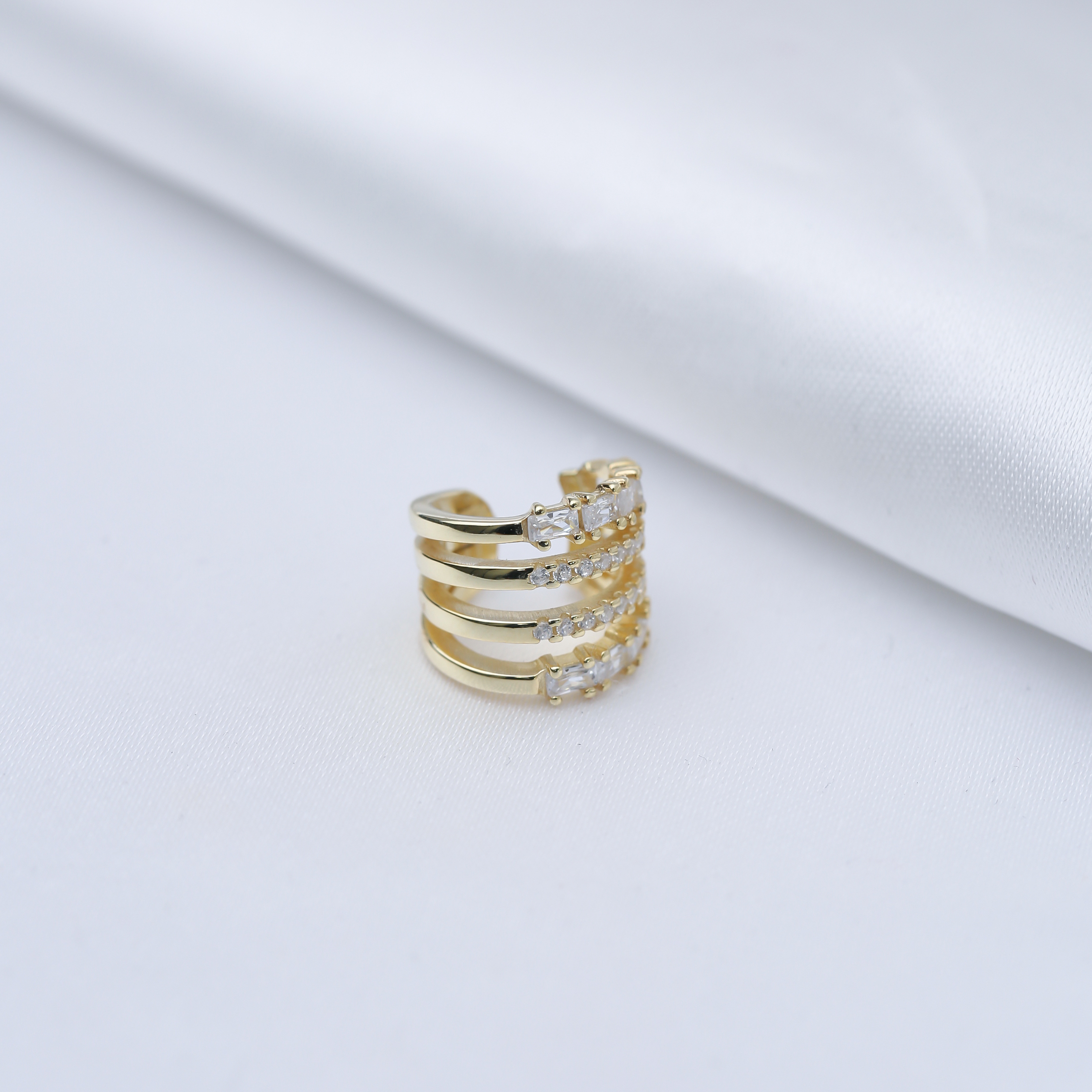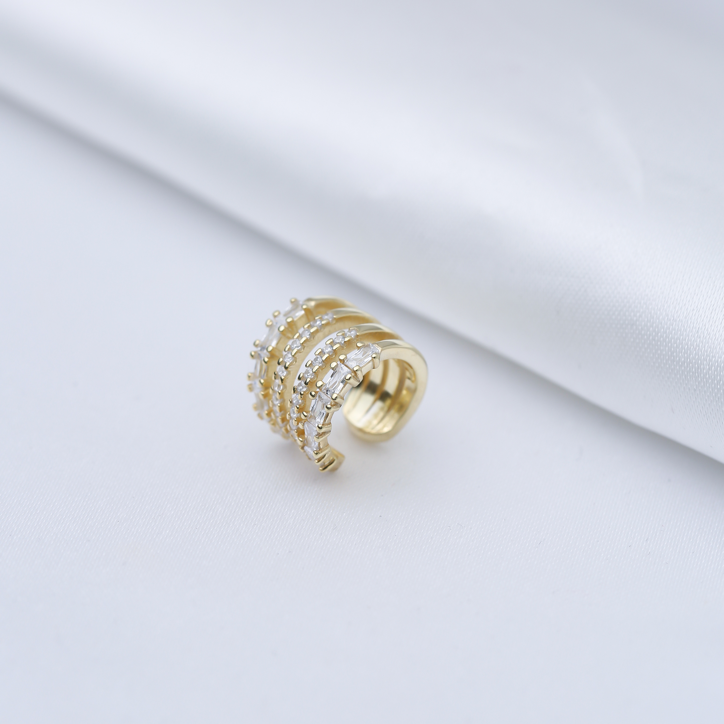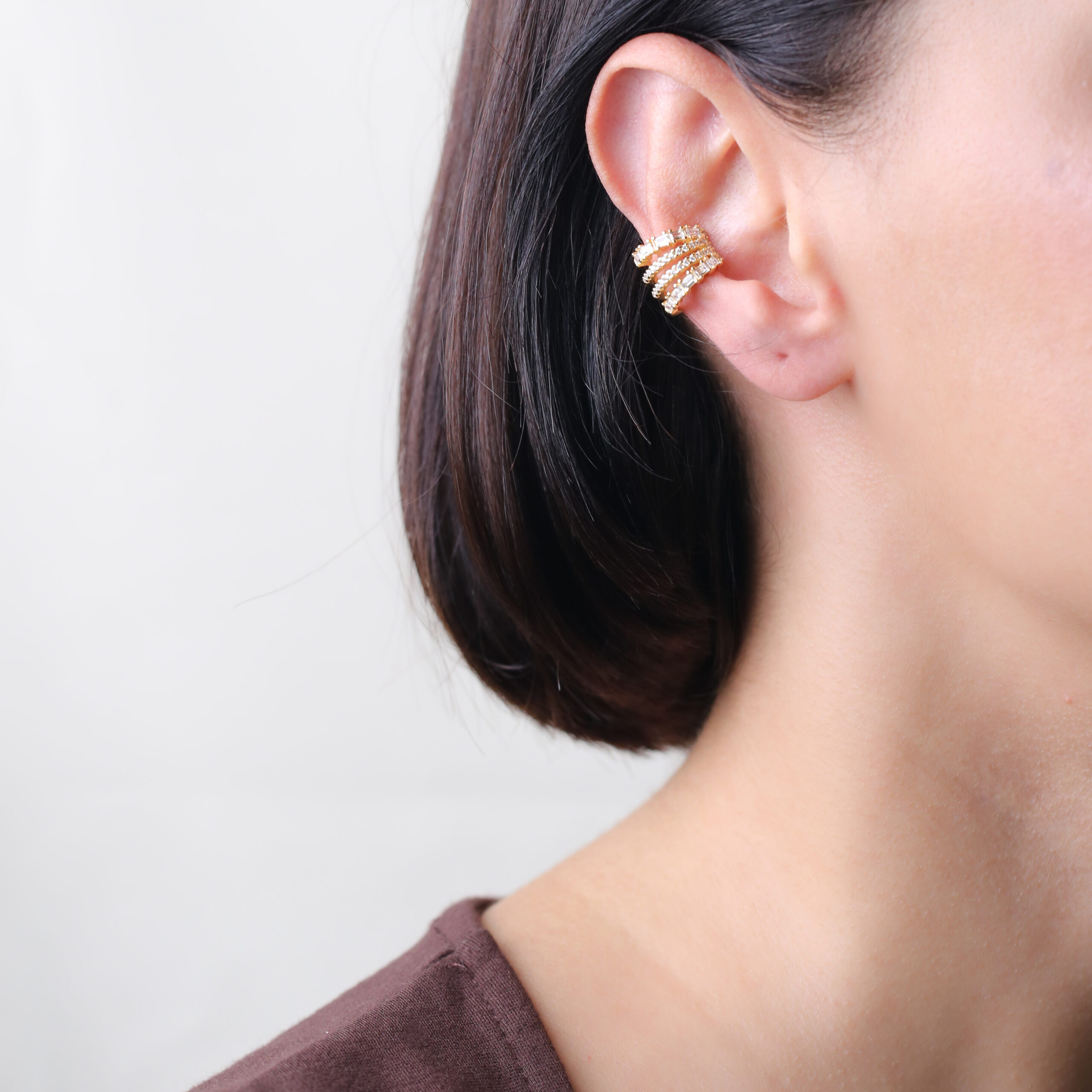 Ear cuff Cartilage Mimoza en argent 925 doré or 16K, serti d’oxydes de zirconium baguette. Un bijou vendu à l’unité lumineux sans perçage, alliant modernité et artisanat turc.