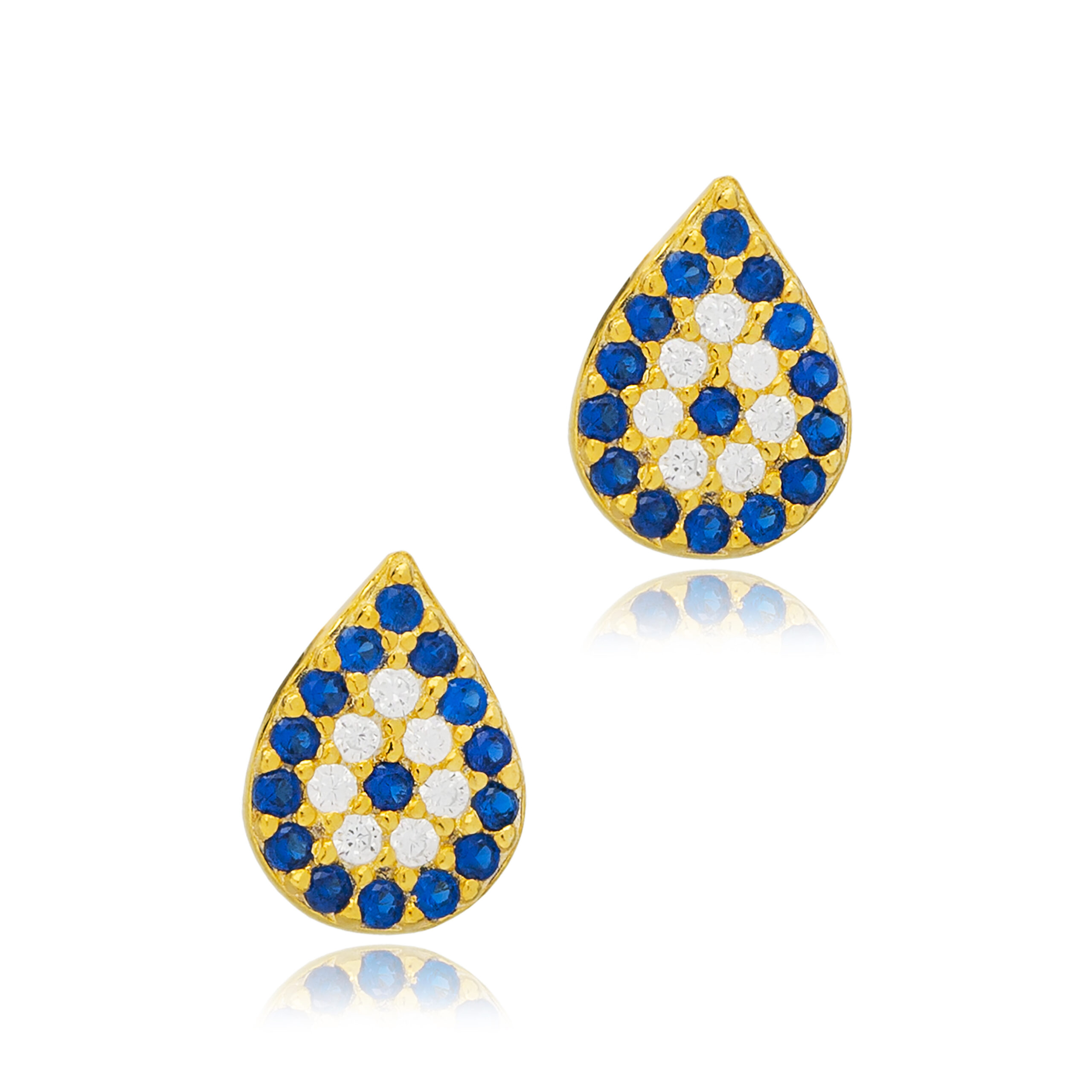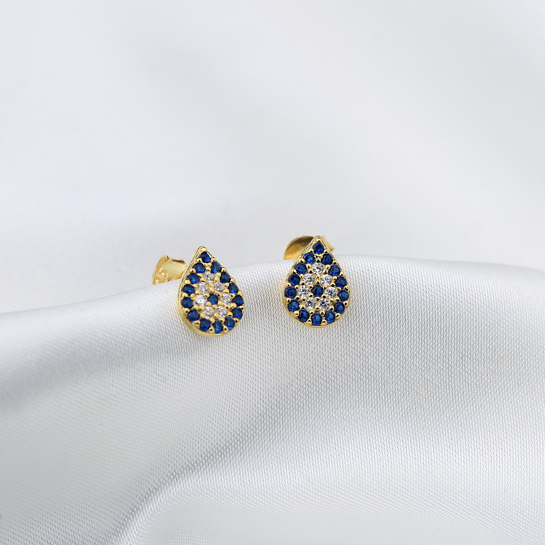 Les Puces Gözde Gardienne en argent 925 doré or 16K associent un oxyde de zirconium bleu type saphir et un halo d’oxydes clairs pour créer un mini-talisman lumineux.